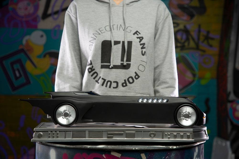 Batmobile in polystone in scala 1/10, dimensioni ca. 16 x 63 x 27 cm su base, licenza ufficiale.