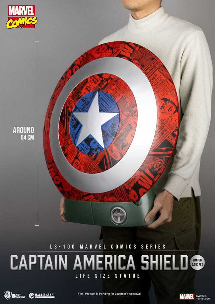 Realizzata in PVC di alta qualità e con una verniciatura vivace, rappresenta fedelmente l'eroismo e l'eredità di Capitano America, rendendola un'aggiunta sorprendente a qualsiasi esposizione.