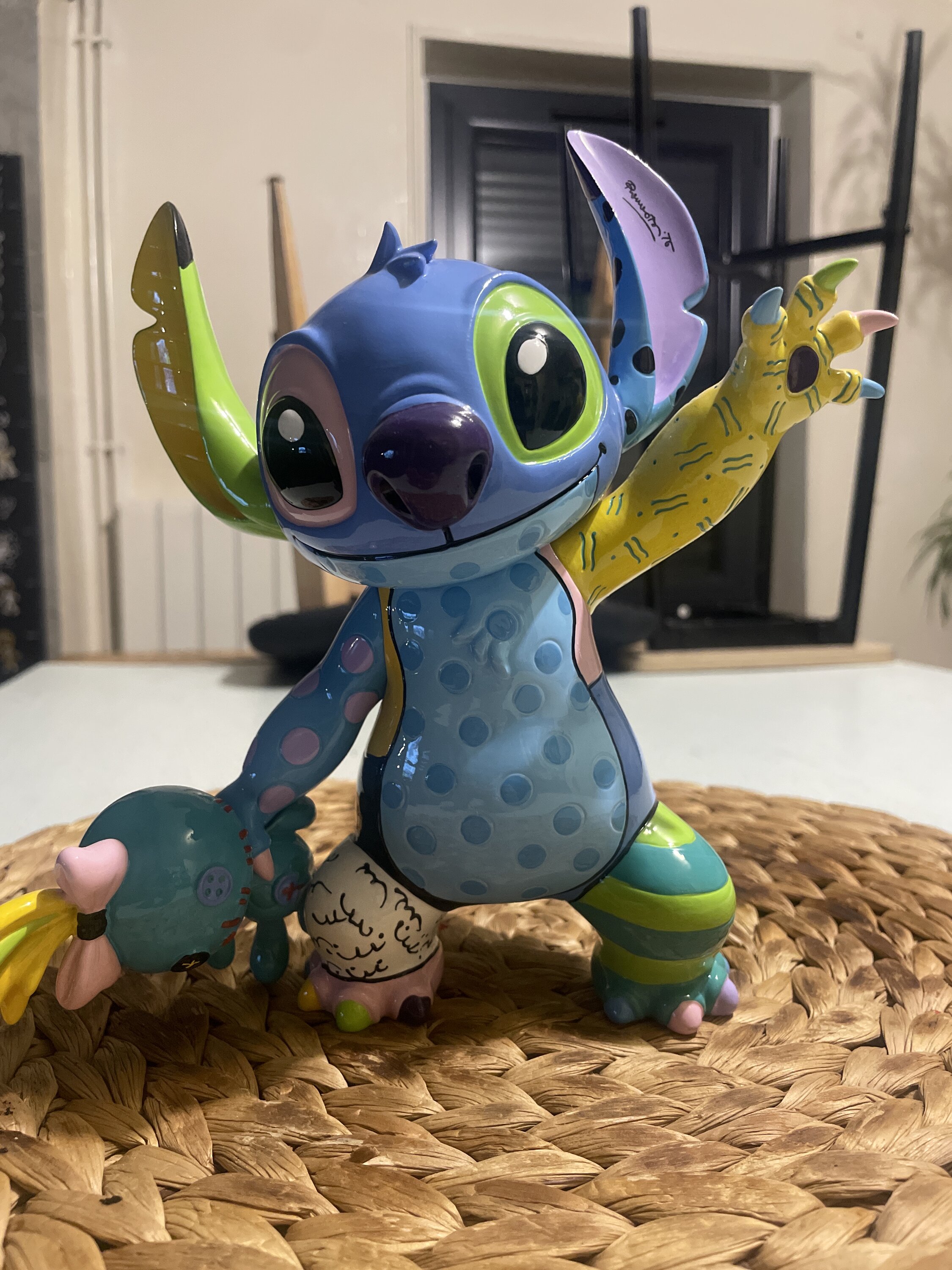 Il simpatico alieno Disney, Stitch, ha ricevuto il trattamento Romero Britto in questa accattivante figura, in uscita nel 2024. Tenendo la fidata bambola di pezza Scrump di Lilo in una mano e salutandola con l'altra, questa figura dipinta a mano e dai colori vivaci sembrerebbe ottimo come pezzo da esposizione in ogni casa. L'uso del colore e del motivo da parte di Britto è inconfondibile, con motivi e tavolozza che si scontrano insieme, rendendo questo pezzo un oggetto da collezione davvero unico. Questo non è un giocattolo o un prodotto per bambini. Destinato solo agli adulti.