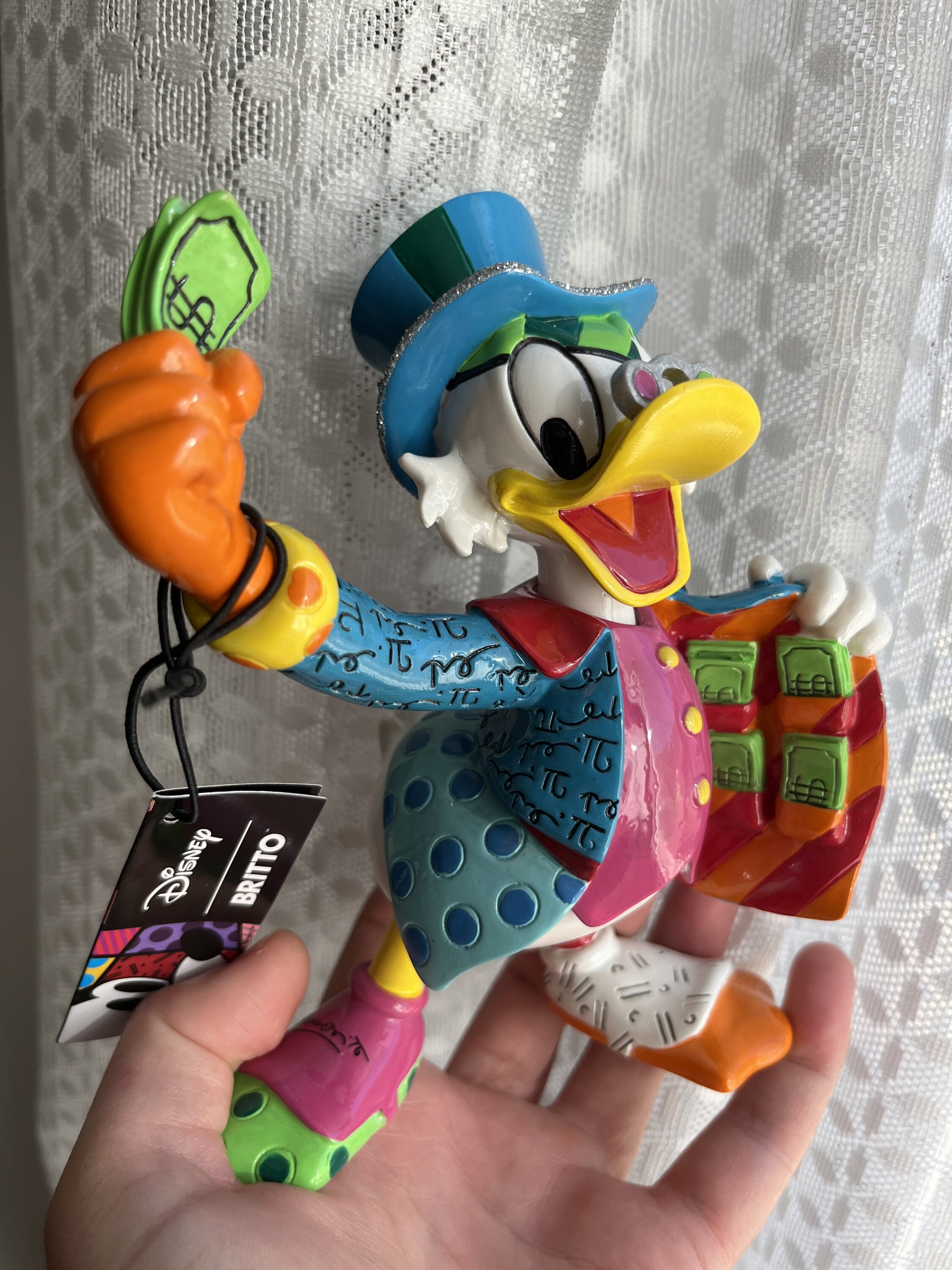 In questa figurina, Zio Paperone con le tasche piene di banconote mostra la sua ricchezza. Ogni statuetta Disney by Britto, decorata in stile pop art dall'artista internazionale Romeo Britto, è realizzata in resina dipinta a mano con una finitura laccata e lucida.