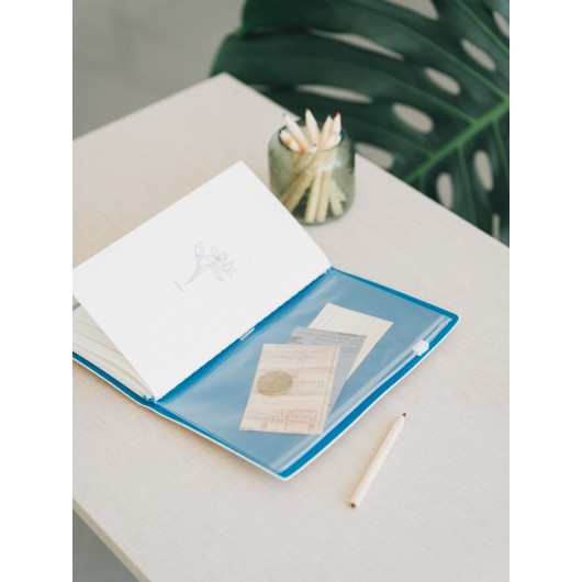 Taccuino da viaggio con copertina in morbido poliuretano. Include spazio per carte, due quaderni sostituibili da 80 fogli (160 pagine) con due diversi tipi di pagina (a punti e a righe) e una tasca all'estremità. Ha una fascia elastica e una chiusura in poliuretano. La copertina misura 12 x 19,5 cm e l'interno misura 10,5 x 18,5 cm.