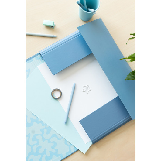 Ha una chiusura elastica, una copertina rigida in cartone spesso 2 mm e una fodera in carta da 150 g con finitura opaca. Misura 34 x 25,5 cm e include 3 alette flessibili, due da 23 x 13 cm e una da 34 x 13 cm.
