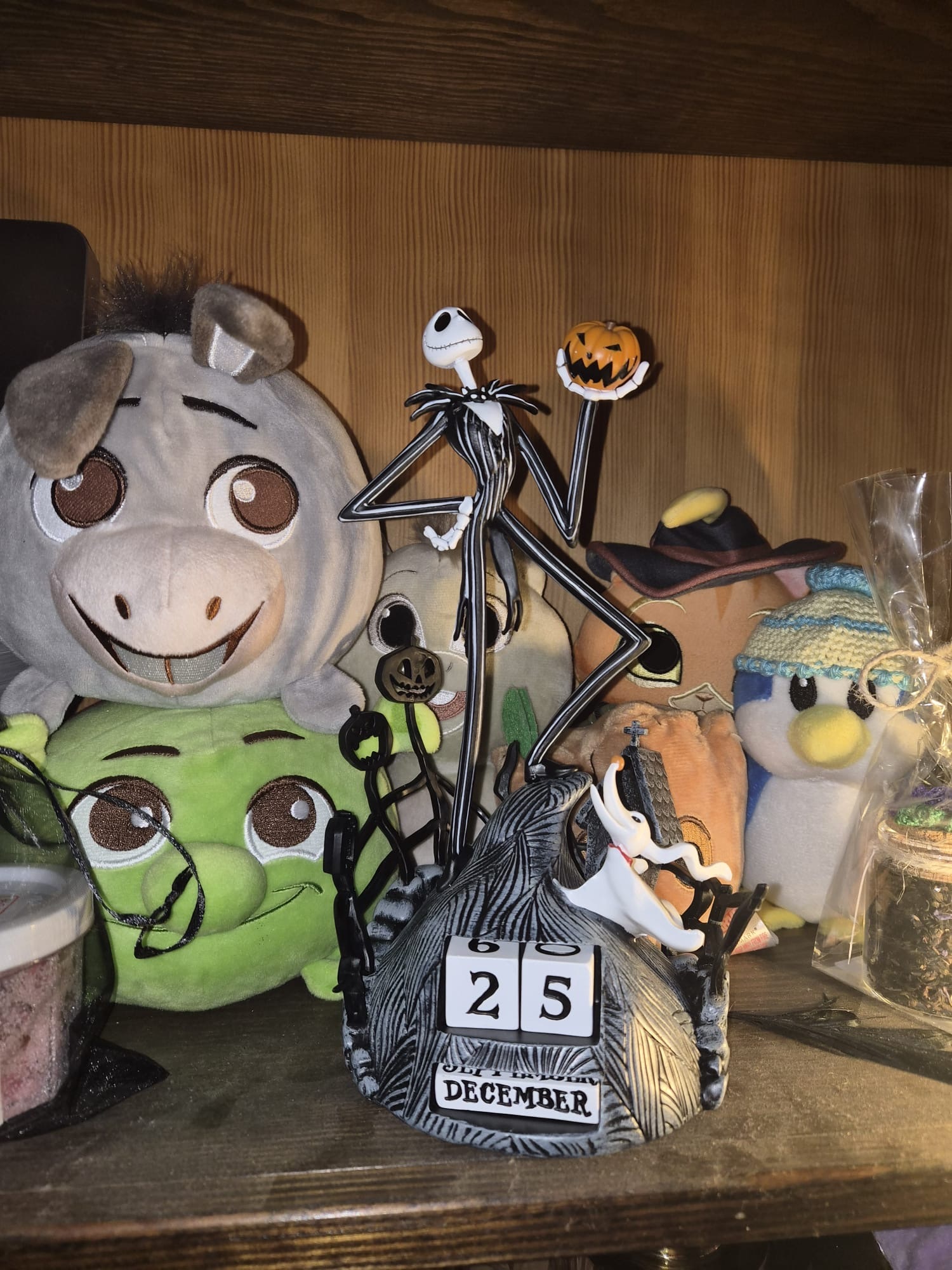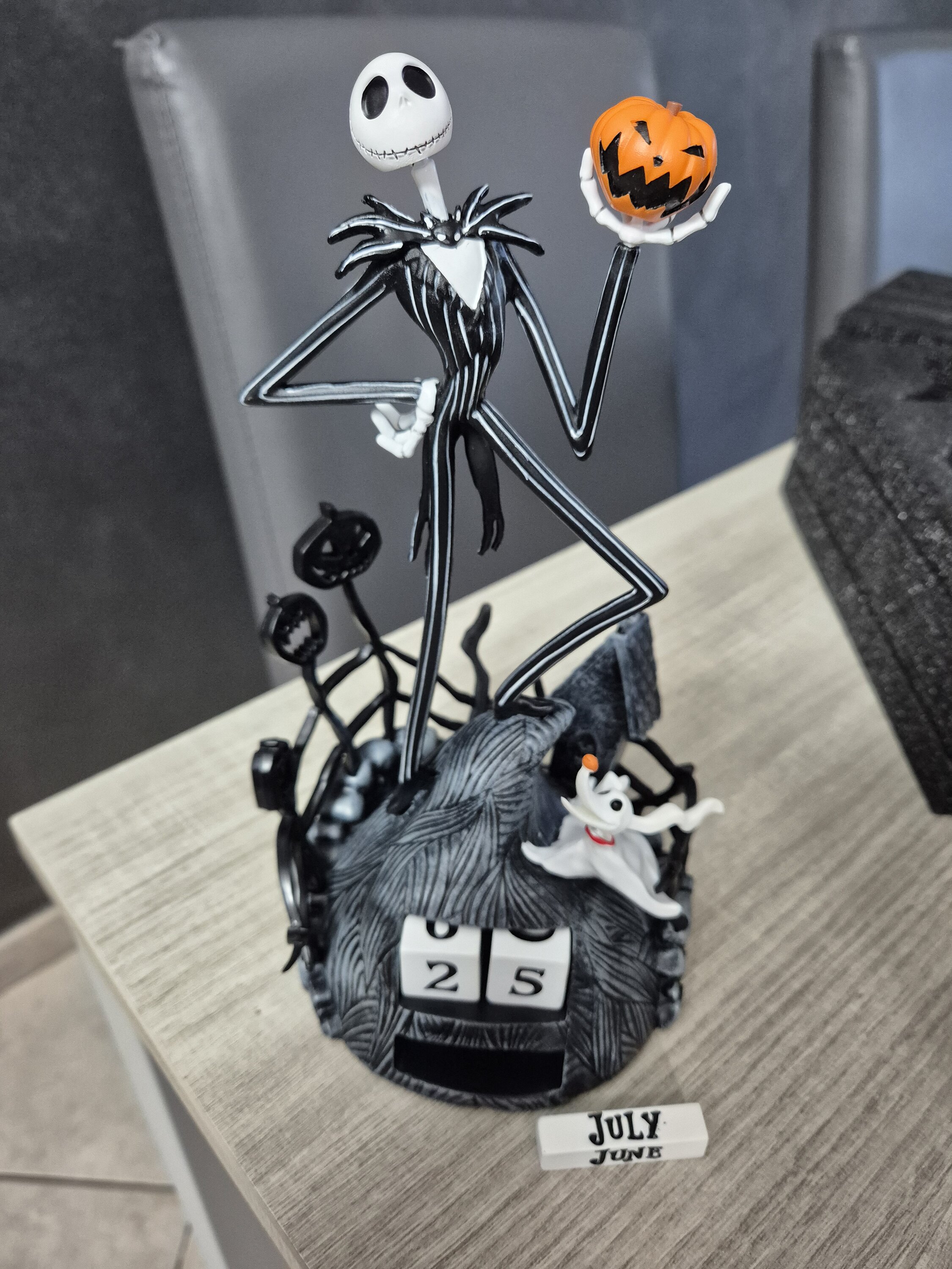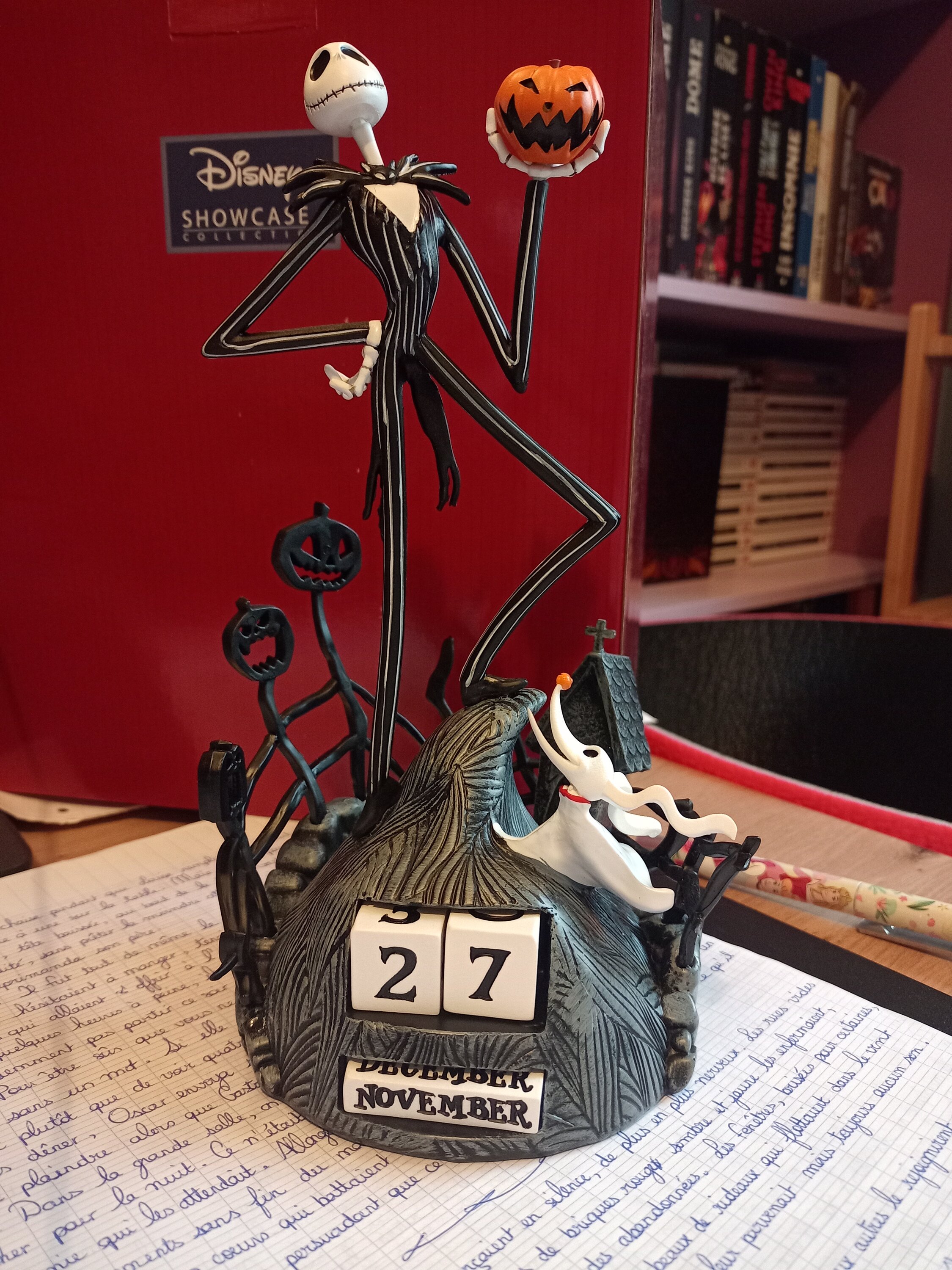 Calendario perpetuo 3D, realizzato in resina e dipinto a mano. È composto da 2 parti mobili, la zucca e la testa di Jack Skellington, queste due parti sono sostituibili tra loro per poter personalizzare la statuetta. Include 5 blocchi con giorni e mesi che possono essere scambiati e combinati per ottenere tutte le date possibili.