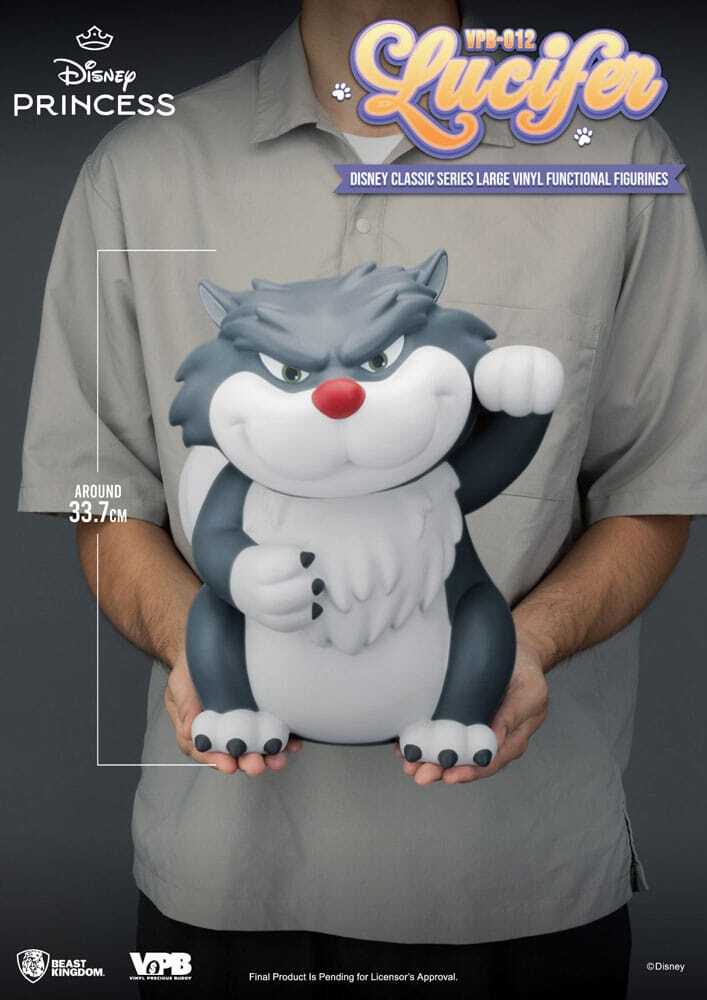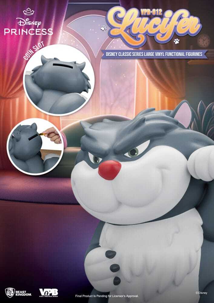Questo salvadanaio in vinile da 33 cm raffigura Lucifero, il gatto dispettoso di Cenerentola, in un design giocoso e dettagliato. Perfetto per bambini e fan Disney, incoraggia il risparmio aggiungendo un tocco decorativo a qualsiasi stanza.