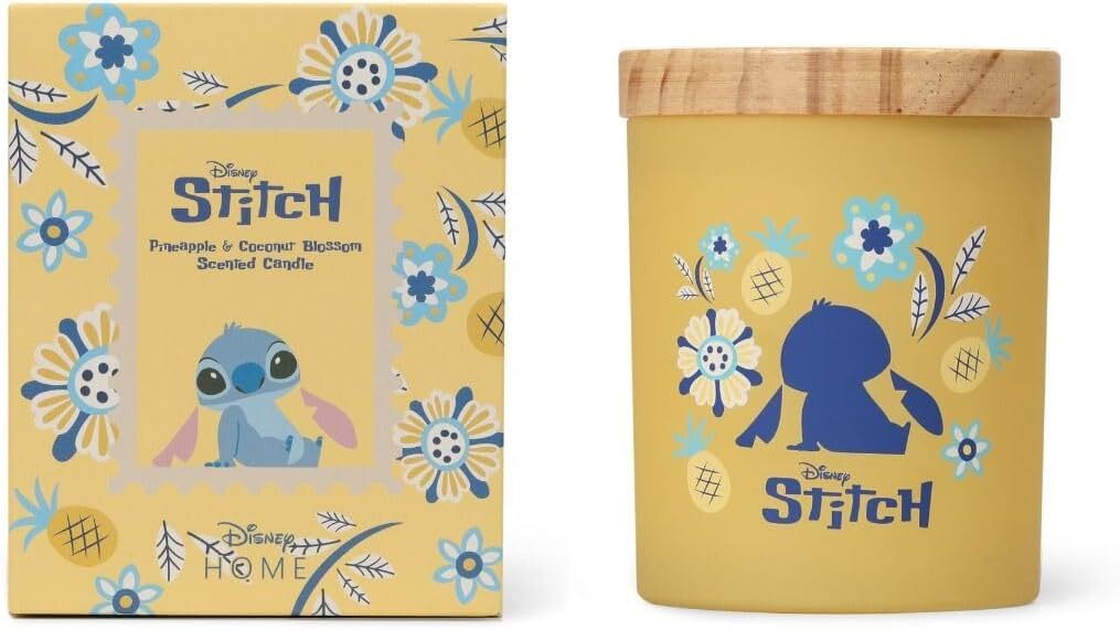 Presentata in un elegante contenitore di vetro giallo con una giocosa silhouette Stitch sul lato, la candela presenta un coperchio dal design accattivante ed è disponibile in una confezione regalo gialla coordinata, che la rende l'aggiunta perfetta alla collezione di qualsiasi fan Disney.