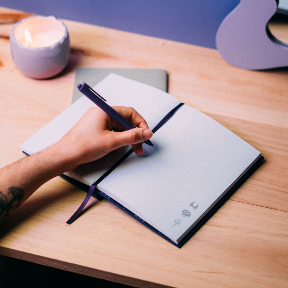 Quaderno A5 (14,8 x 21 cm). Copertina rigida con effetto lenticolare , che rivela un'immagine dinamica se vista da diverse angolazioni. Copertina posteriore morbida al tatto, angoli squadrati, rilegatura incollata, interno personalizzato con inserto a punta, segnalibro a nastro e tasca interna. L'interno contiene 96 fogli (192 pagine) di carta da 100 g/m².