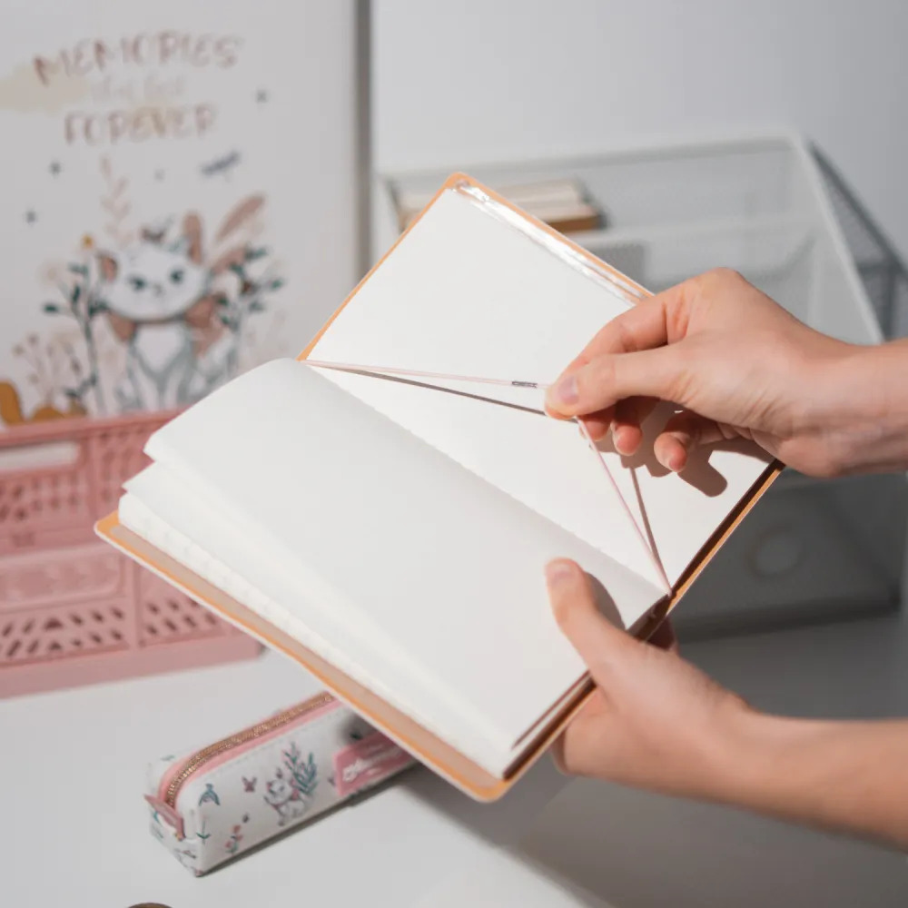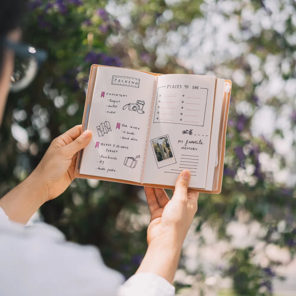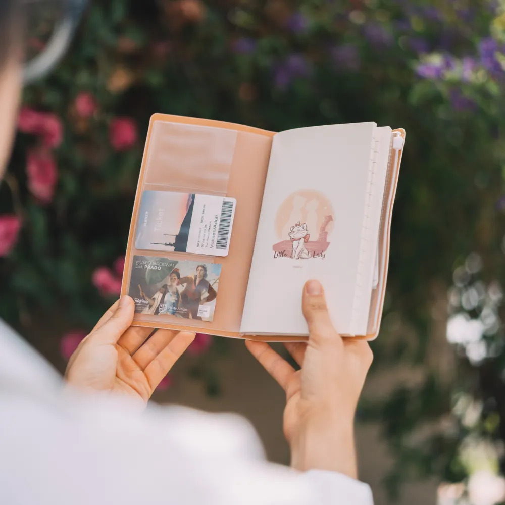 Diario di viaggio con copertina in poliuretano morbido. Include uno scomparto per mappa, due quaderni da 80 fogli (160 pagine) con due diversi tipi di carta (a righe e a punti) e una tasca interna posteriore. Presenta una chiusura elastica e un bottone automatico in poliuretano.