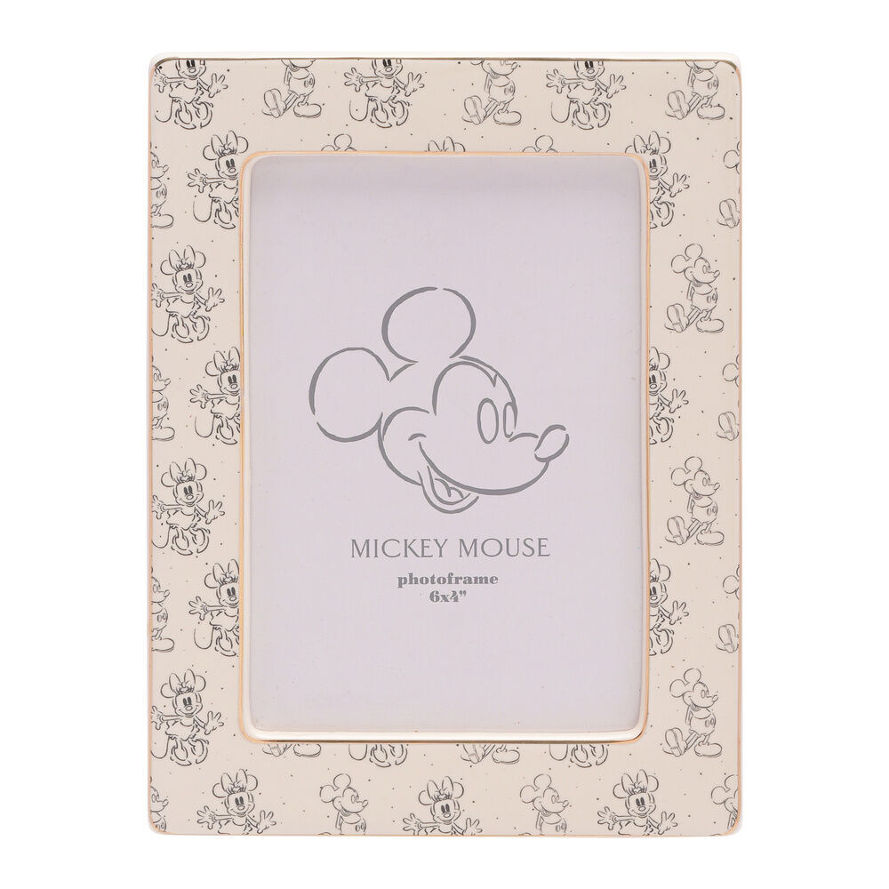 La cornice portafoto in ceramica bianca presenta una finitura maculata, completa di dettagli dorati e immagini stampate di Topolino e Paperina. È progettata per l'esposizione in verticale utilizzando il supporto in dotazione.