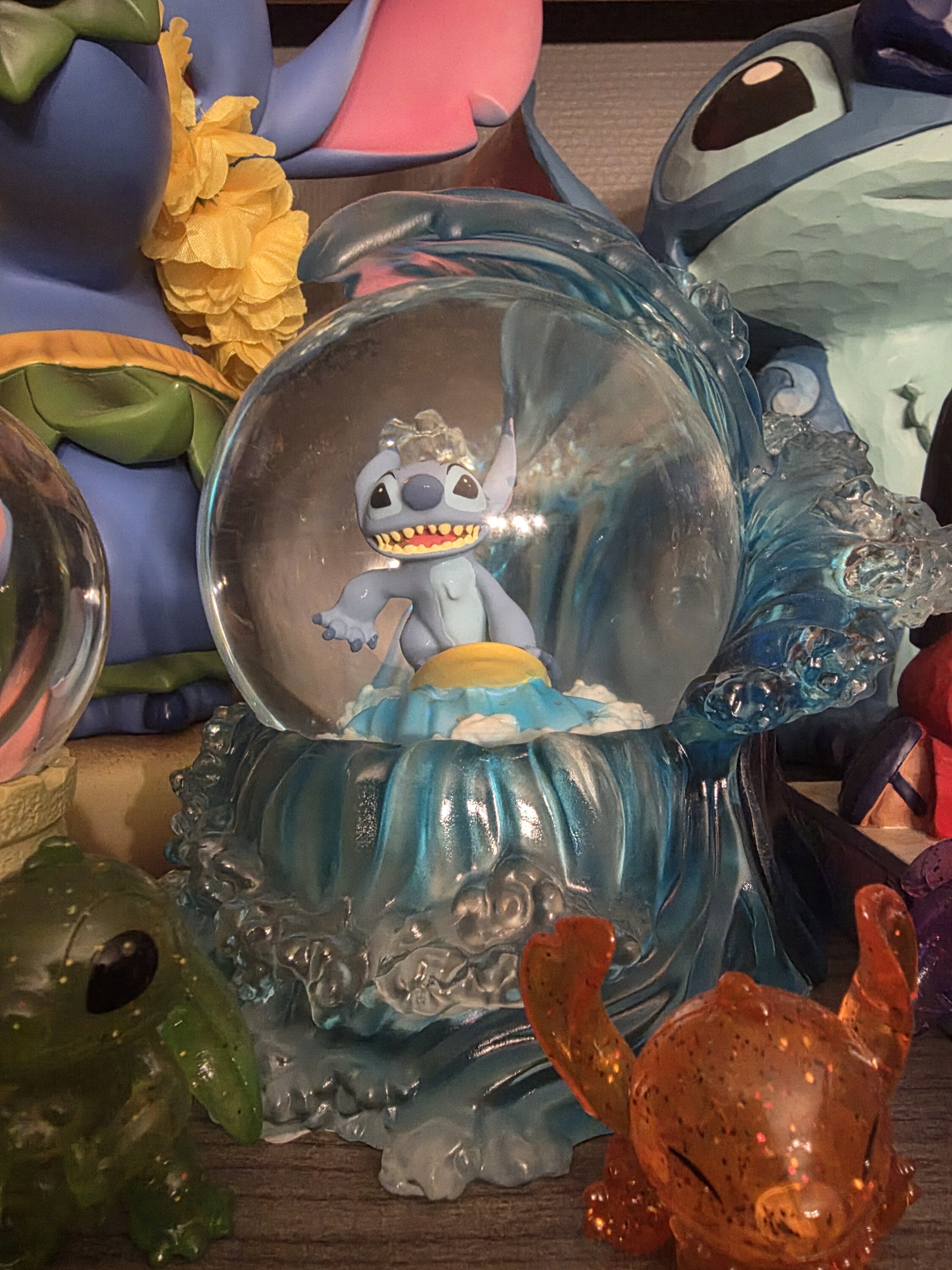 Stitch diventa completamente aggressivo e fa uno spruzzo tubolare in questa palla d'acqua in resina splendidamente scolpita. Completamente racchiuso in un'onda di resina trasparente, il Stitch rimarrà sospeso o sarà completamente spazzato via?