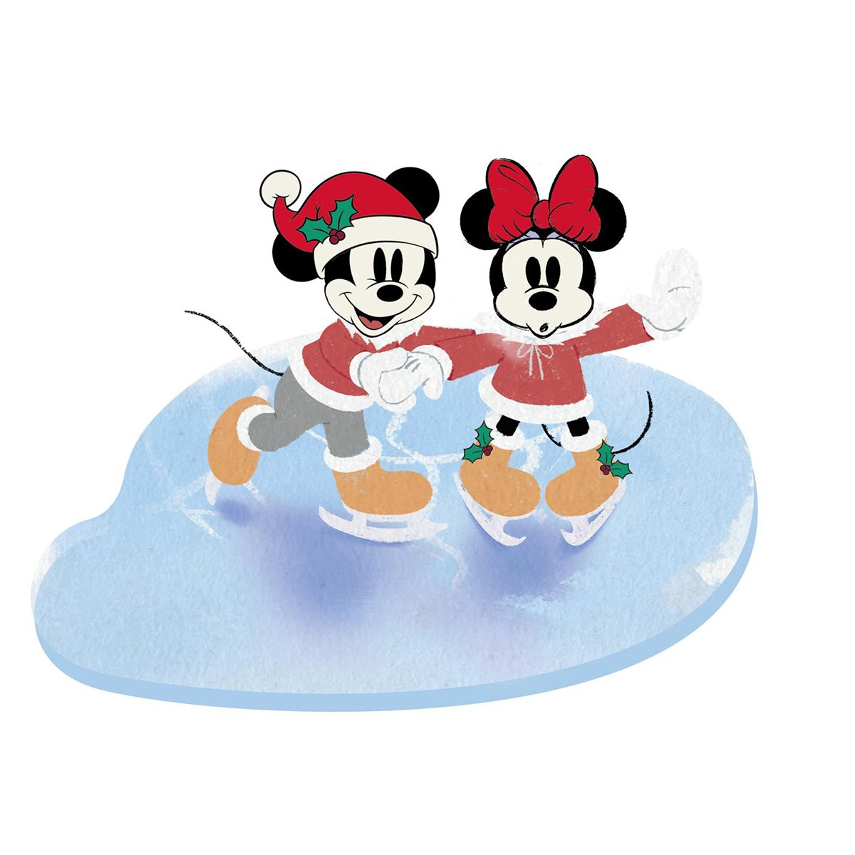Topolino e Minnie celebrano la stagione in questa scena festiva. Topolino tiene ferma Minnie mentre scivola attraverso lo stagno.