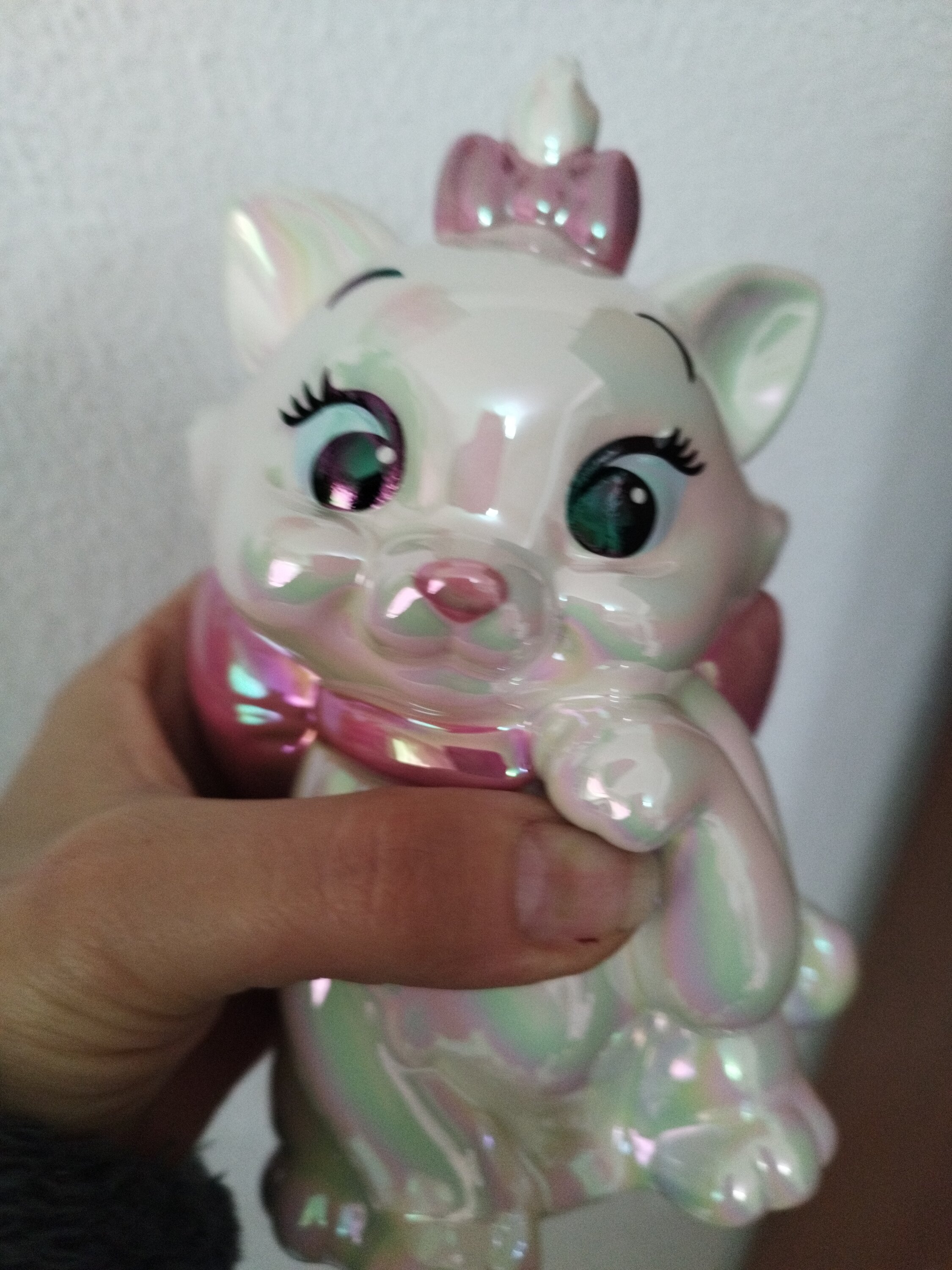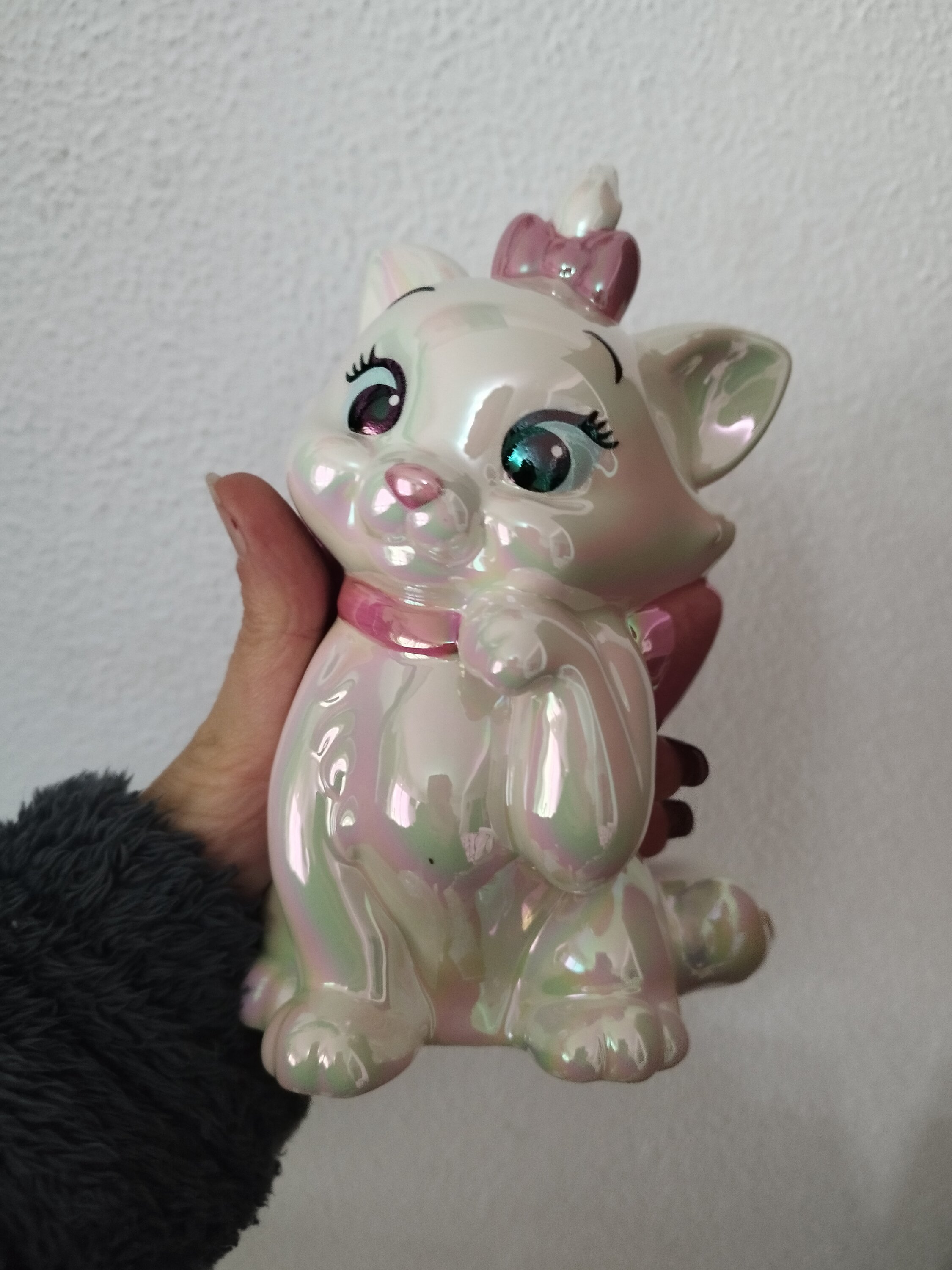Marie, l'adorabile gattina del classico animato Disney Gli Aristogatti, è protagonista di questo salvadanaio in ceramica modellato e dipinto a mano . Uno speciale processo di galvanica conferisce a Marie una lucentezza iridescente unica e molto accattivante.