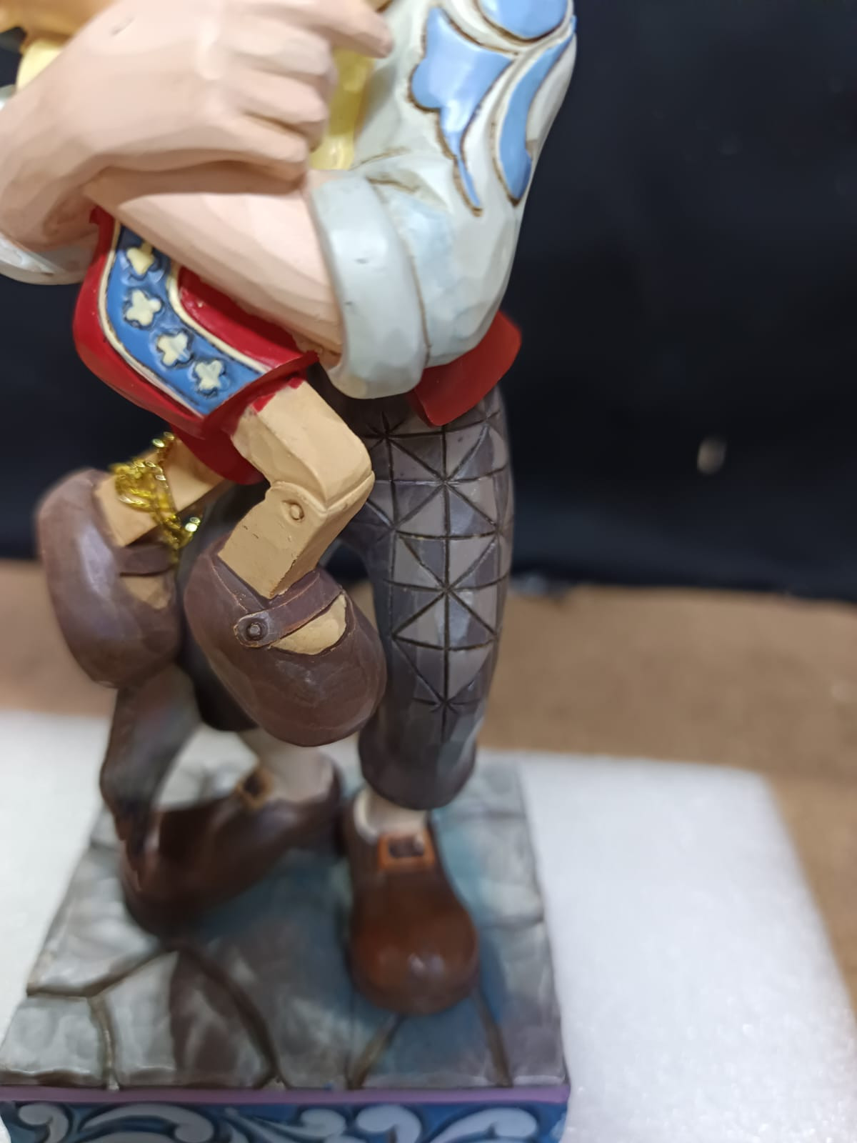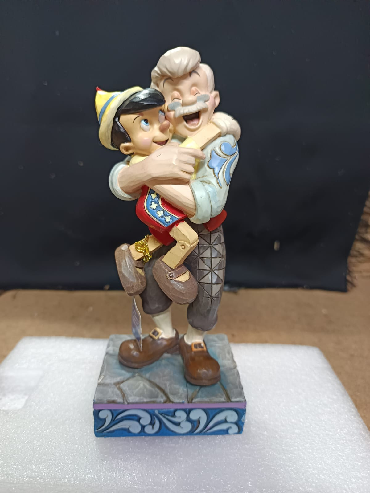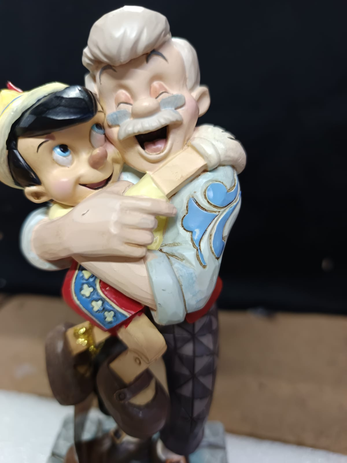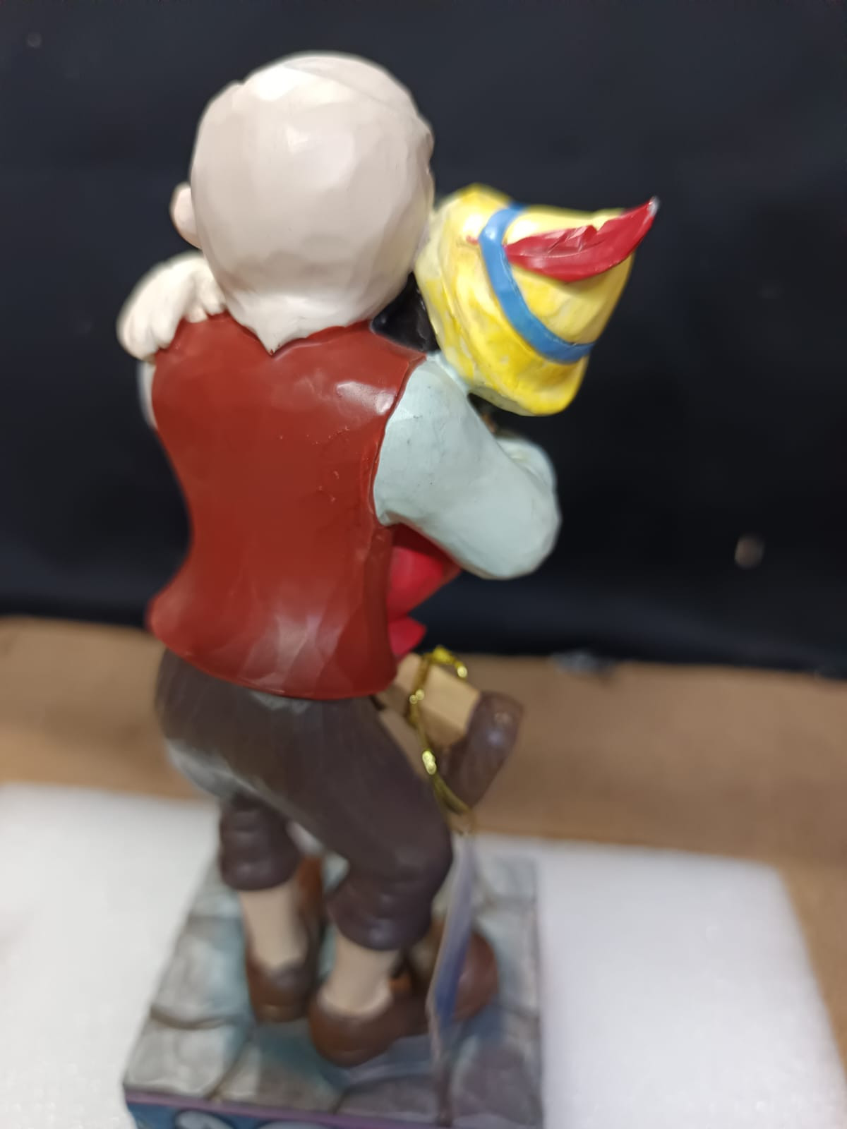 - Piccoli difetti di vernice sulla fronte di Pinocchio, sulla mano di Geppetto e sul dorso della giacca di Geppetto