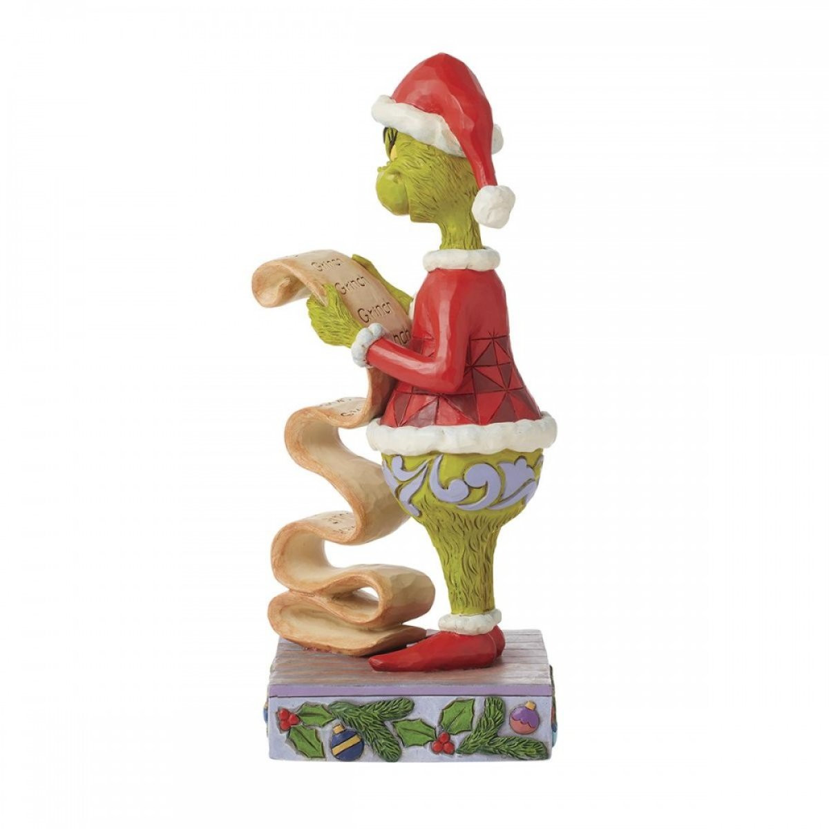 Questa statuetta disegnata da Jim Shore presenta il Grinch vestito da Babbo Natale che esamina un lungo elenco di persone cattive e simpatiche. Complottando per rovinare il Natale, il Grinch sposta tutti i nomi sulla lista dei cattivi per assicurarsi che nessuno riceva regali quest'anno. Dalla collezione Grinch, progettata dal pluripremiato artista e scultore Jim Shore. Ogni statuetta è dipinto a mano e sono previste leggere variazioni di colore, rendendo ogni pezzo unico. Confezionato in una scatola regalo. Questi articoli non sono giocattoli per bambini. Destinato solo agli adulti.