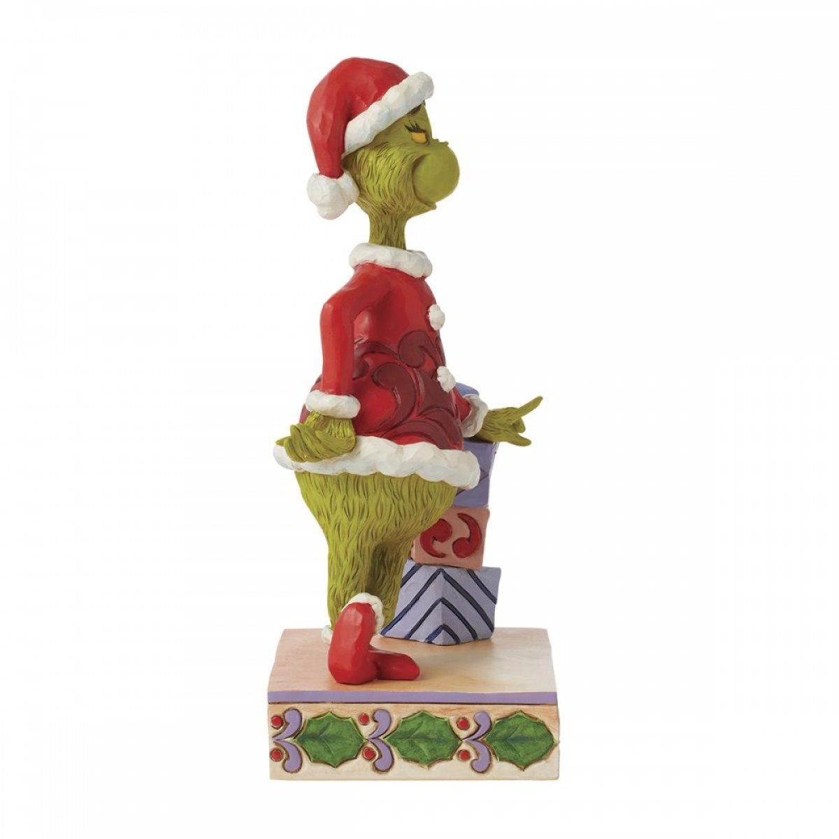 Questa statuetta Jim Shore presenta il Grinch vestito da Babbo Natale appoggiato a una pila di regali splendidamente incartati. A gambe incrociate, il Grinch sta con atteggiamento e una mano sul fianco. Ruberà il Natale o imparerà ad amare la stagione? Dalla collezione Grinch, progettata dal pluripremiato artista e scultore Jim Shore. Ogni statuetta è dipinto a mano e sono previste leggere variazioni di colore, rendendo ogni pezzo unico. Confezionato in una scatola regalo. Questi articoli non sono giocattoli per bambini. Destinato solo agli adulti.