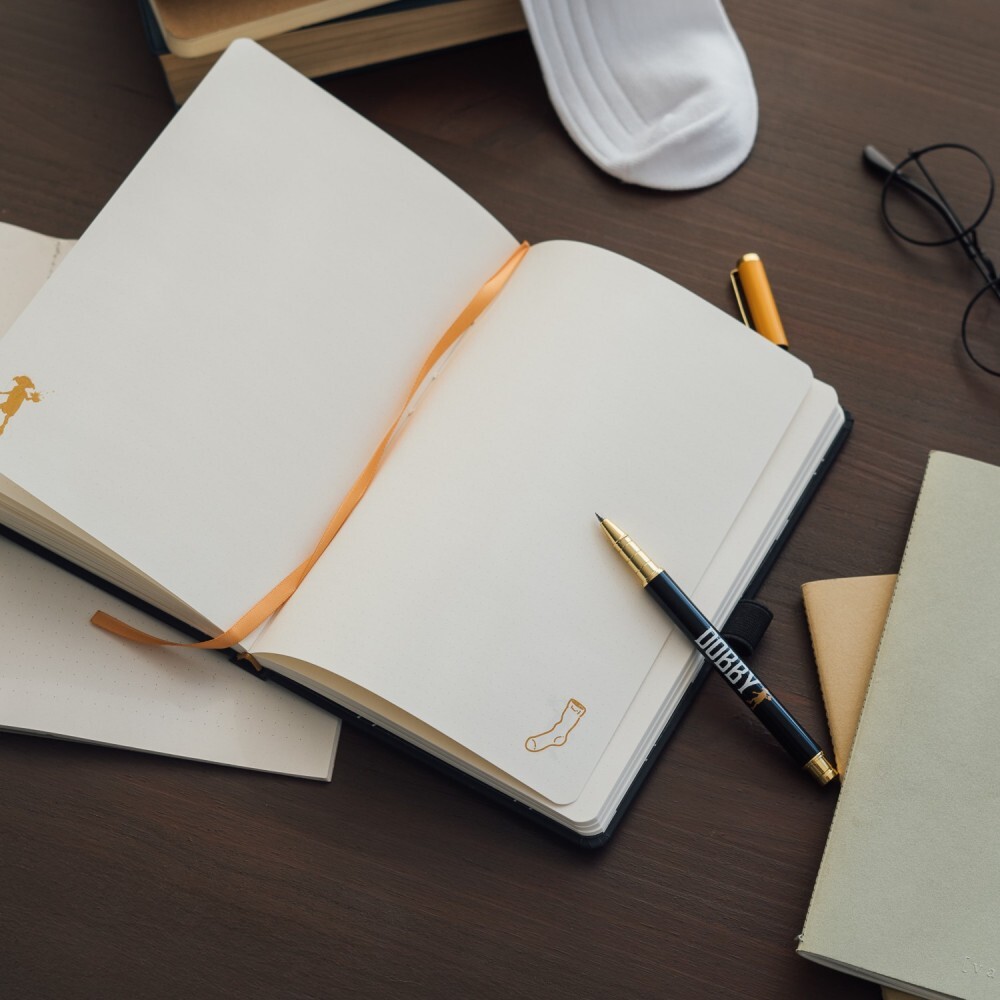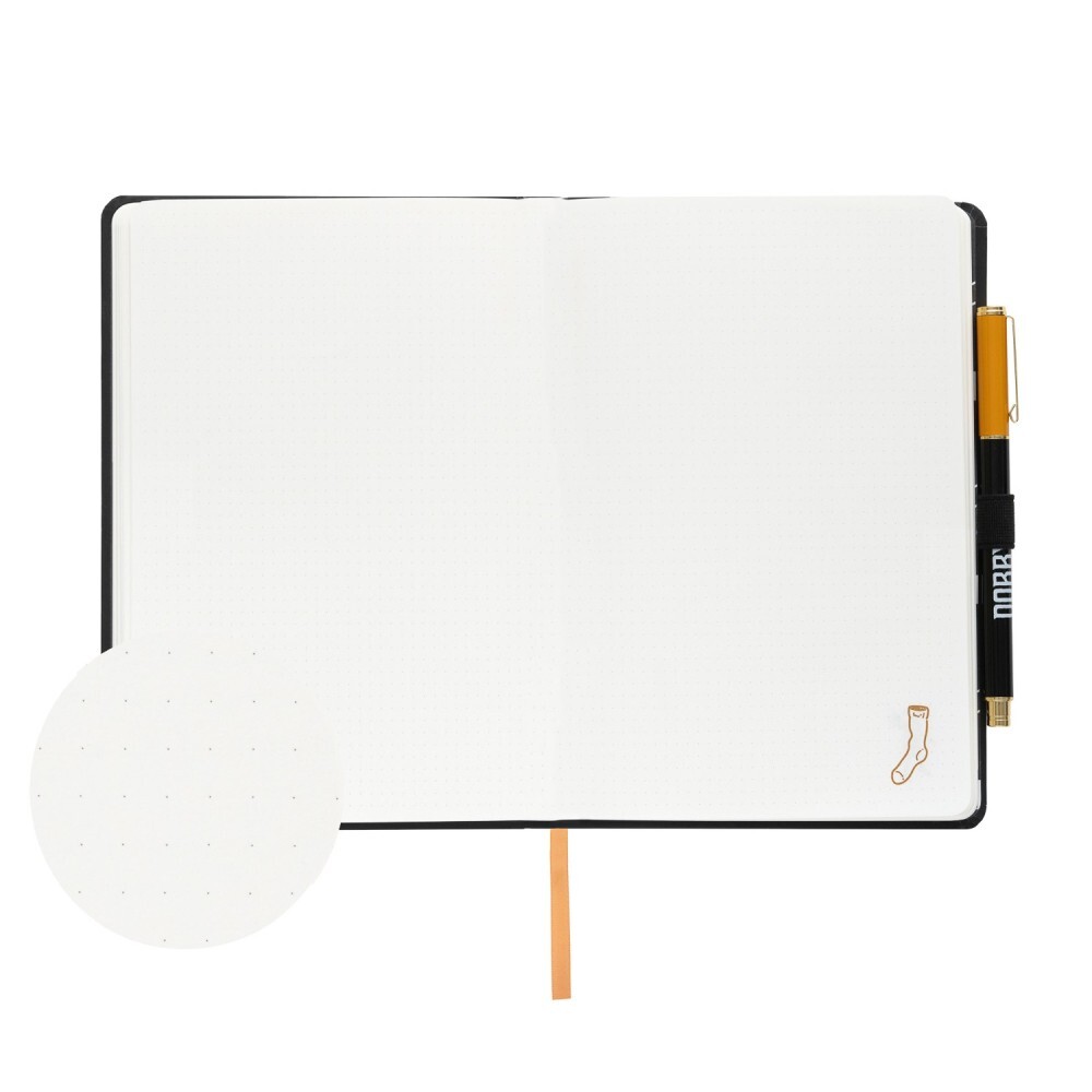 Quaderno A5 (14,8 x 21 cm) con penna. Copertina rigida morbida al tatto, angoli arrotondati, rilegatura incollata, interno personalizzato con inserto a punta, segnalibro a nastro, tasca interna e chiusura a elastico. L'interno contiene 96 fogli (192 pagine) di carta da 100 g/m². Include penna ed elastico.