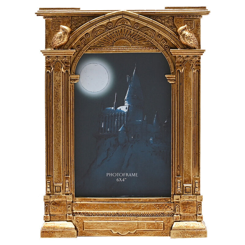 La cornice in resina dorata con ritratto presenta una finitura effetto metallizzato, completa di un design tridimensionale dell'ingresso di Hogwarts. È progettata per essere esposta utilizzando il supporto in dotazione.