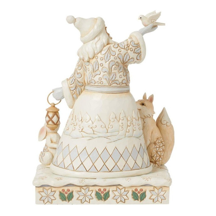Babbo Natale trascorre molto tempo al Polo Nord camminando nella circostante foresta di White Woodland. Questo bellissimo Babbo Natale di Jim Shore condivide una scena di Babbo Natale circondato dai suoi amici pelosi e piumati. Indossa un mantello bianco decorato e un sorriso.