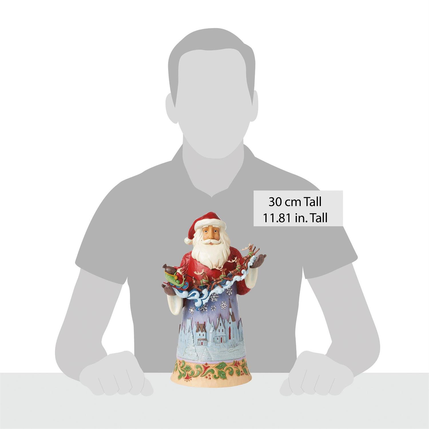 Questo Jim Shore Babbo Natale tiene in mano una versione in miniatura di se stesso che vola sulla sua slitta trainata da renne. Con la scena di una città notturna innevata sulle sue vesti, viene creata una scena della notte Natale . Con rosmarino, fiori e fiocchi di neve, questa statuetta incanta.