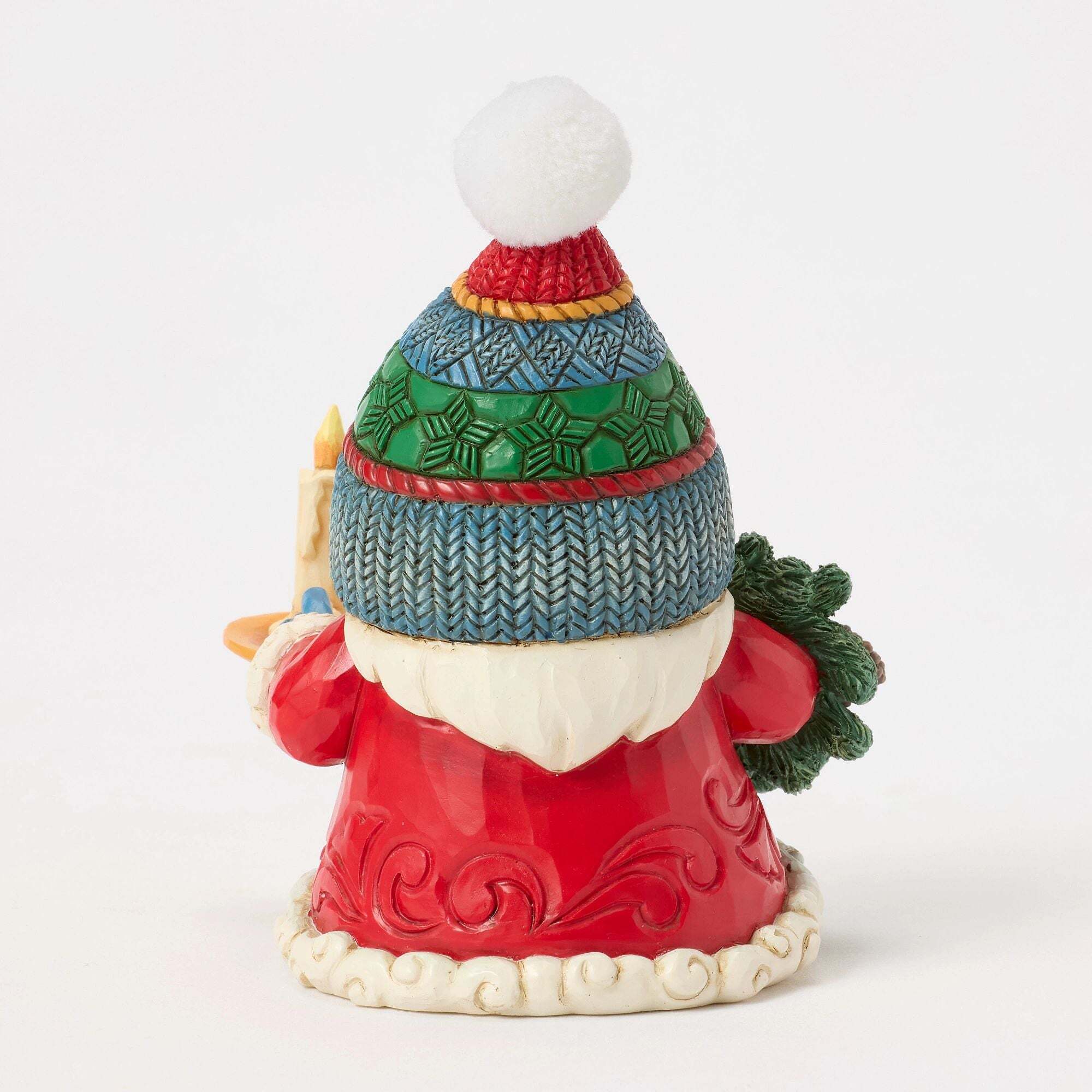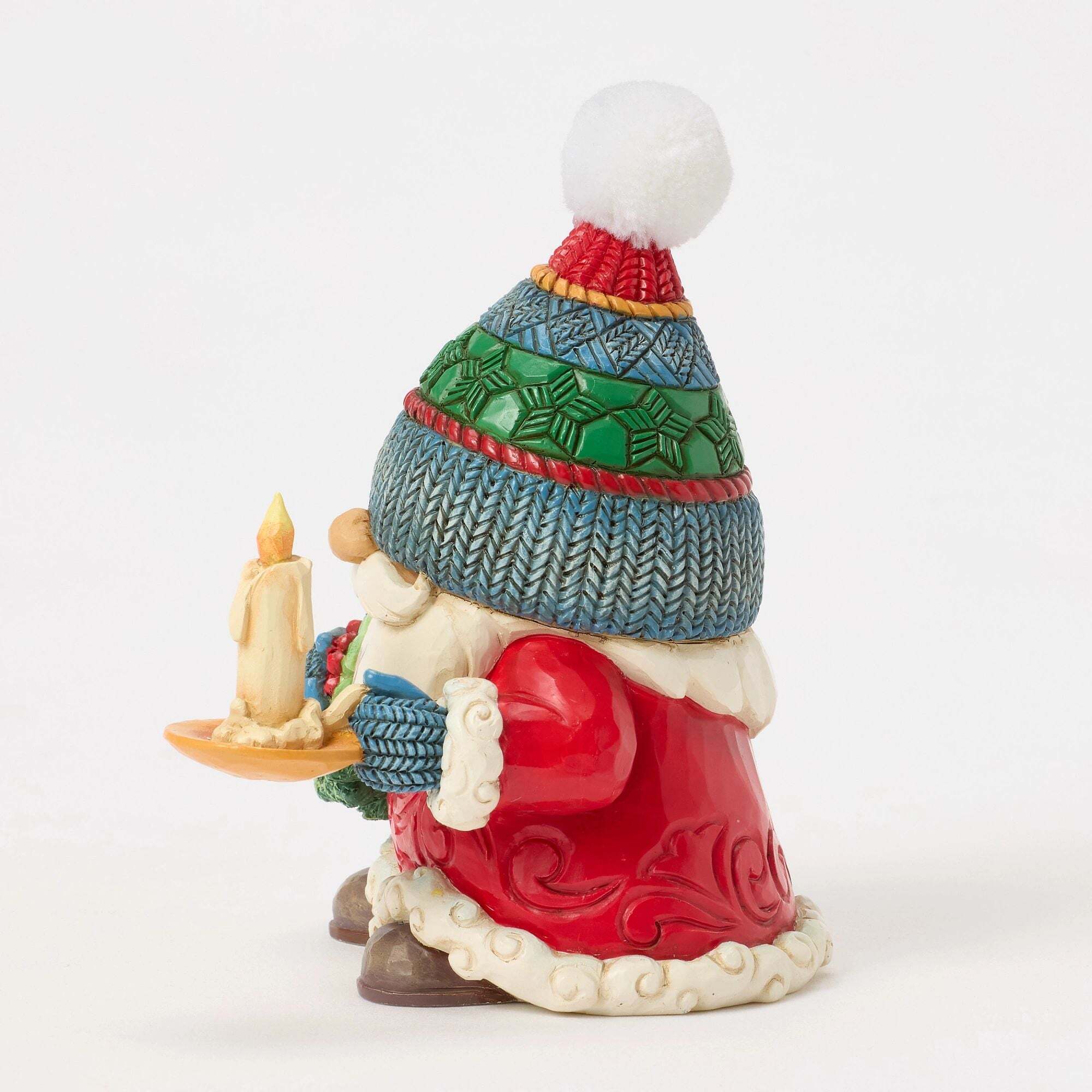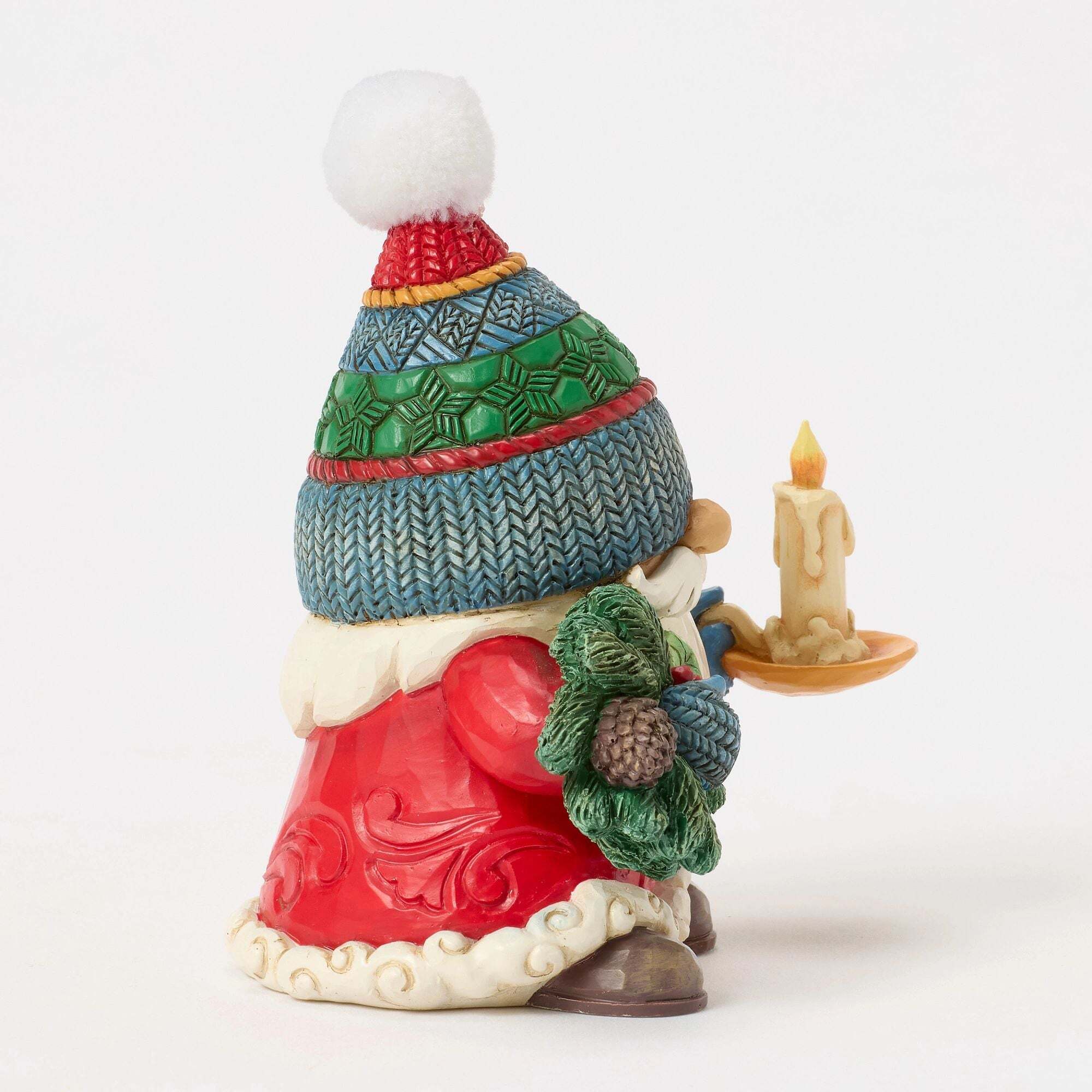 Questo gnomo festoso Jim Shore porta il calore delle feste con una candela accesa in mano e il cappello sugli occhi. Vestito con un cappotto a fantasia floreale e un cappello lavorato, tiene in mano una ghirlanda, pronto a decorare la casa con gioia.