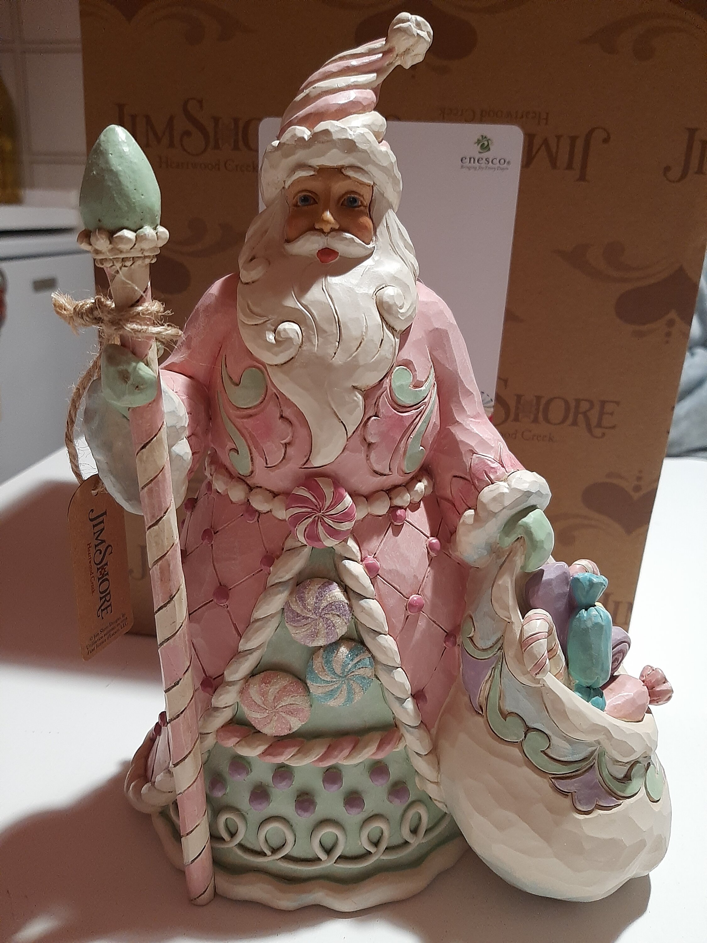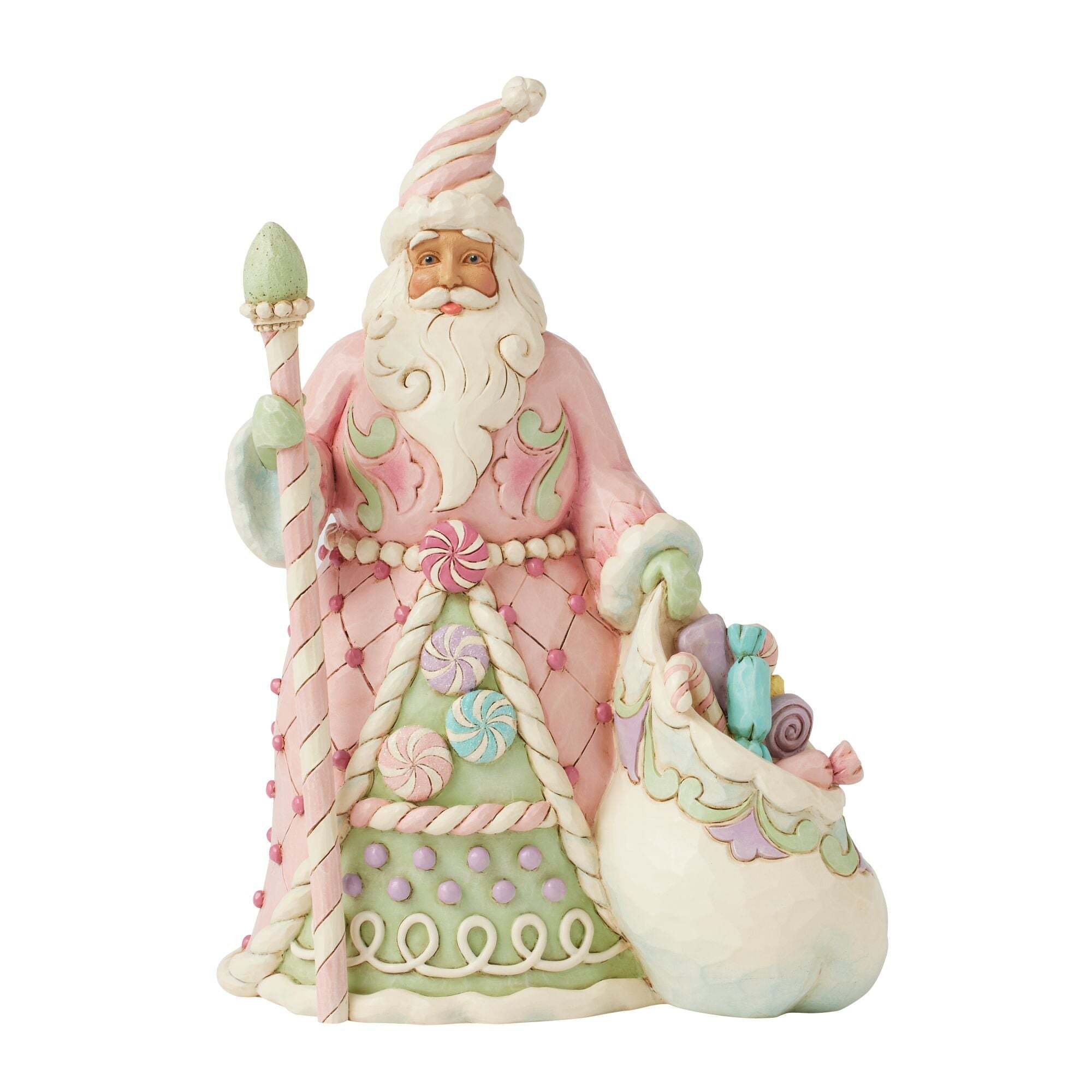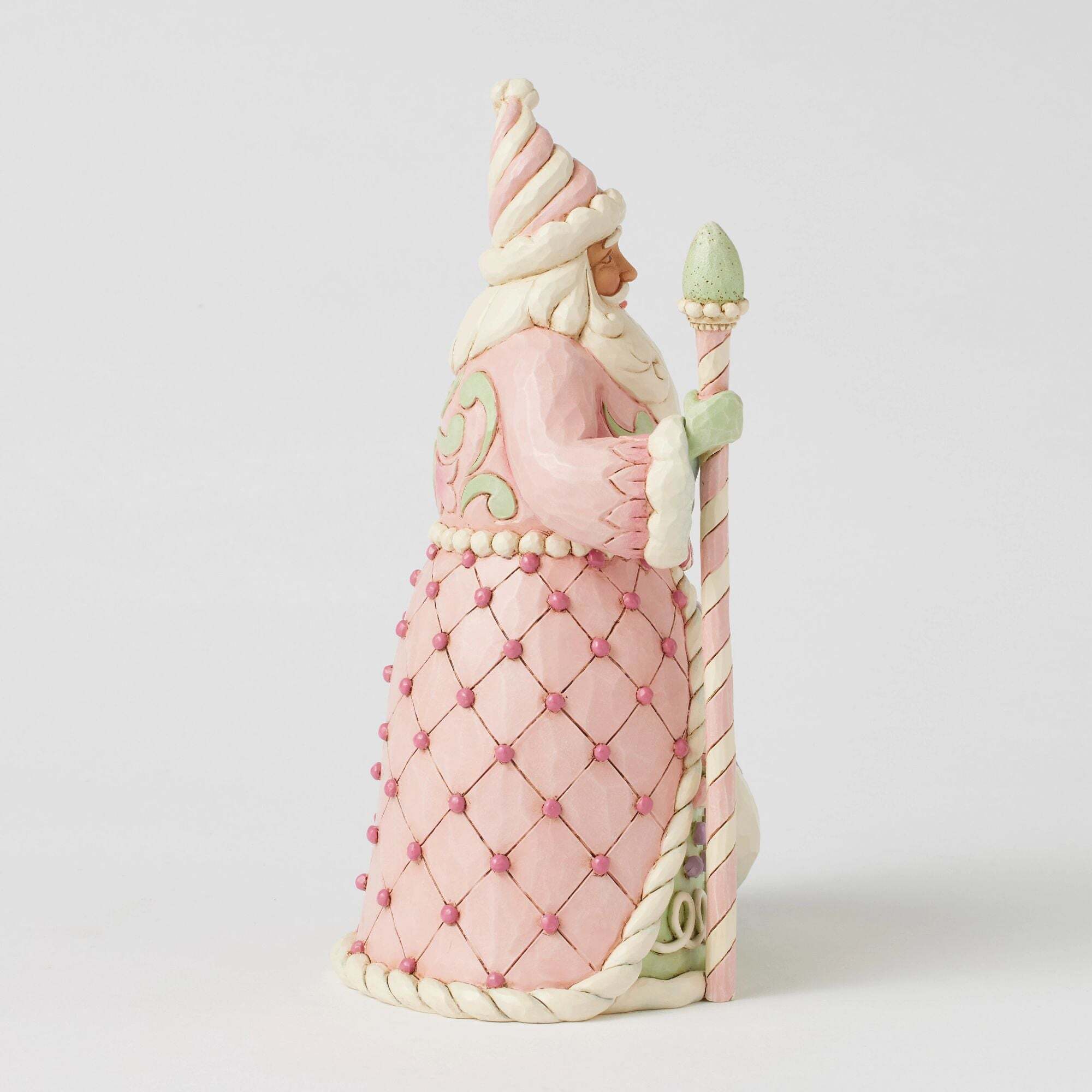 Questa graziosa statuina Natale della collezione Heartwood Sweets, creata da Jim Shore, presenta graziose tonalità pastello di rosa e verde, decorate con caramelle. Tiene in mano un bastoncino di zucchero e un sacchetto di dolcetti, il suo cappello ricorda un gelato vorticoso, mentre il suo mantello presenta i disegni dell'artista.
