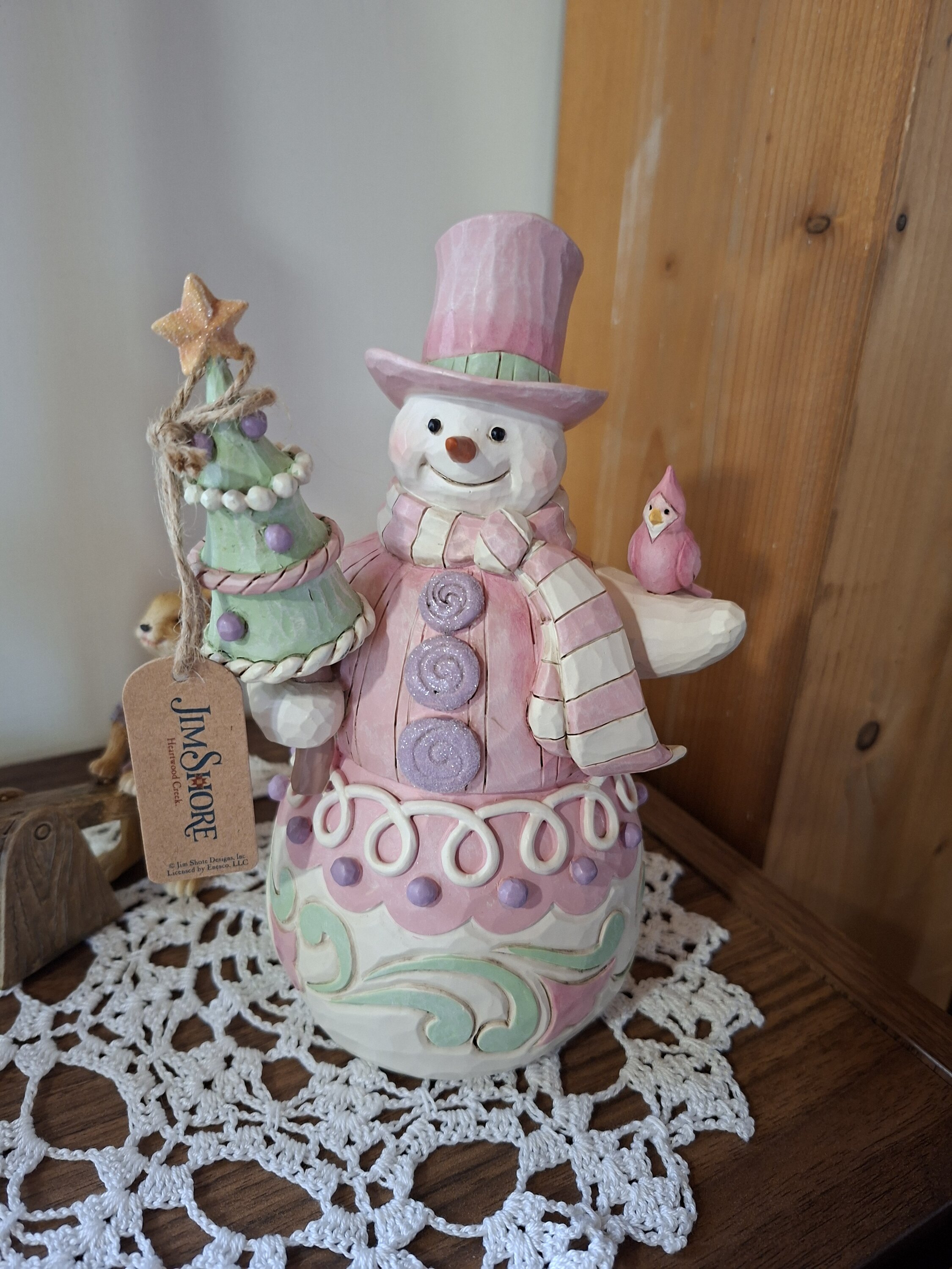 Questo pupazzo di neve rosa pastello della collezione Heartwood Sweets, disegnata da Jim Shore, è ricco di fascino con i suoi delicati motivi, glitter e dettagli, che riflettono lo spirito delle feste. Tiene in mano con affetto un albero decorato e un cardinale.