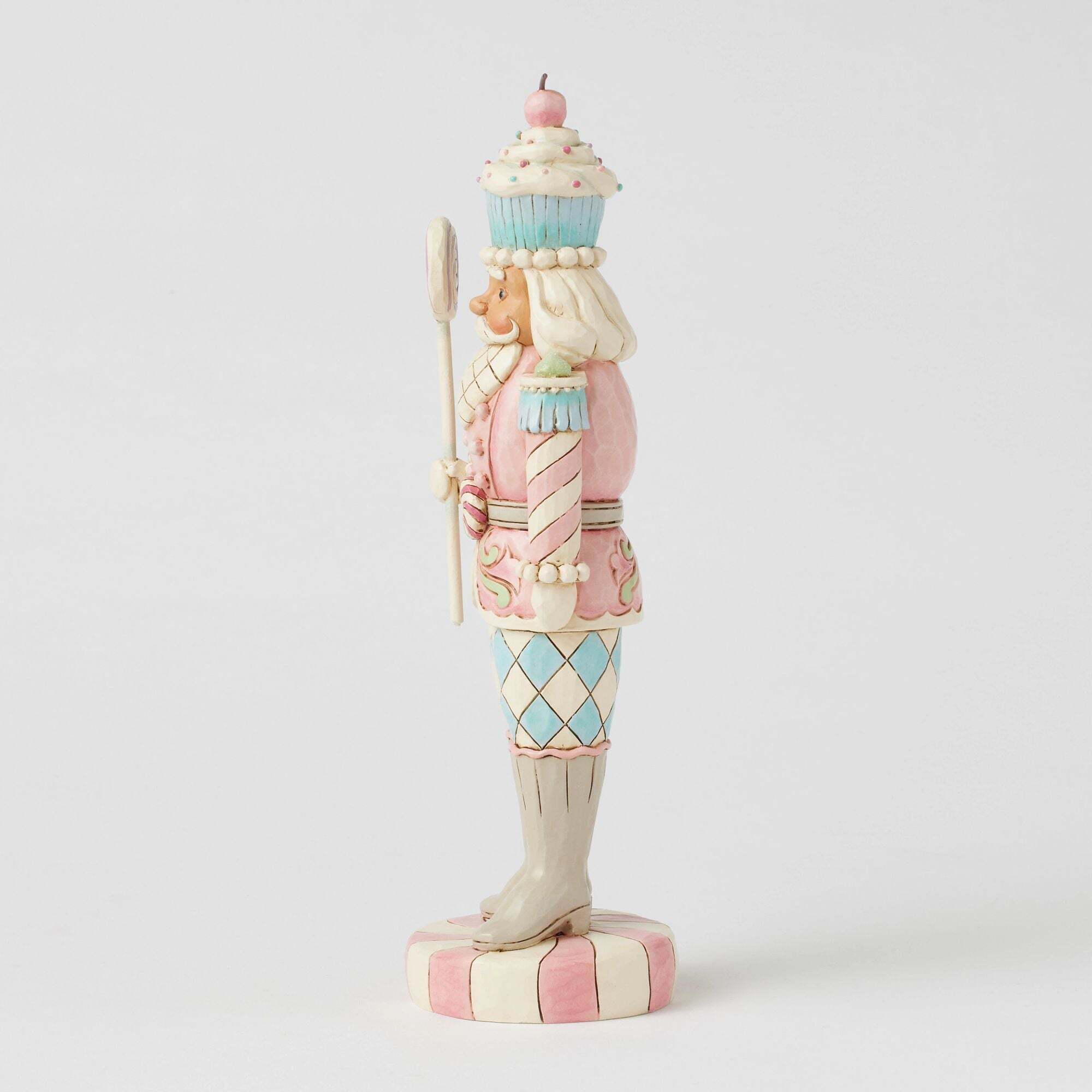 Questa statuetta di un soldatino giocattolo della collezione Heartwood Sweets, disegnata da Jim Shore, si erge fiera su una base color menta piperita, con in mano un bastoncino di lecca-lecca. Con la sua uniforme decorata con glassa e caramelle, completa di fibbia alla menta piperita e grazioso cappello a forma di cupcake, porta un tocco di allegria natalizia.