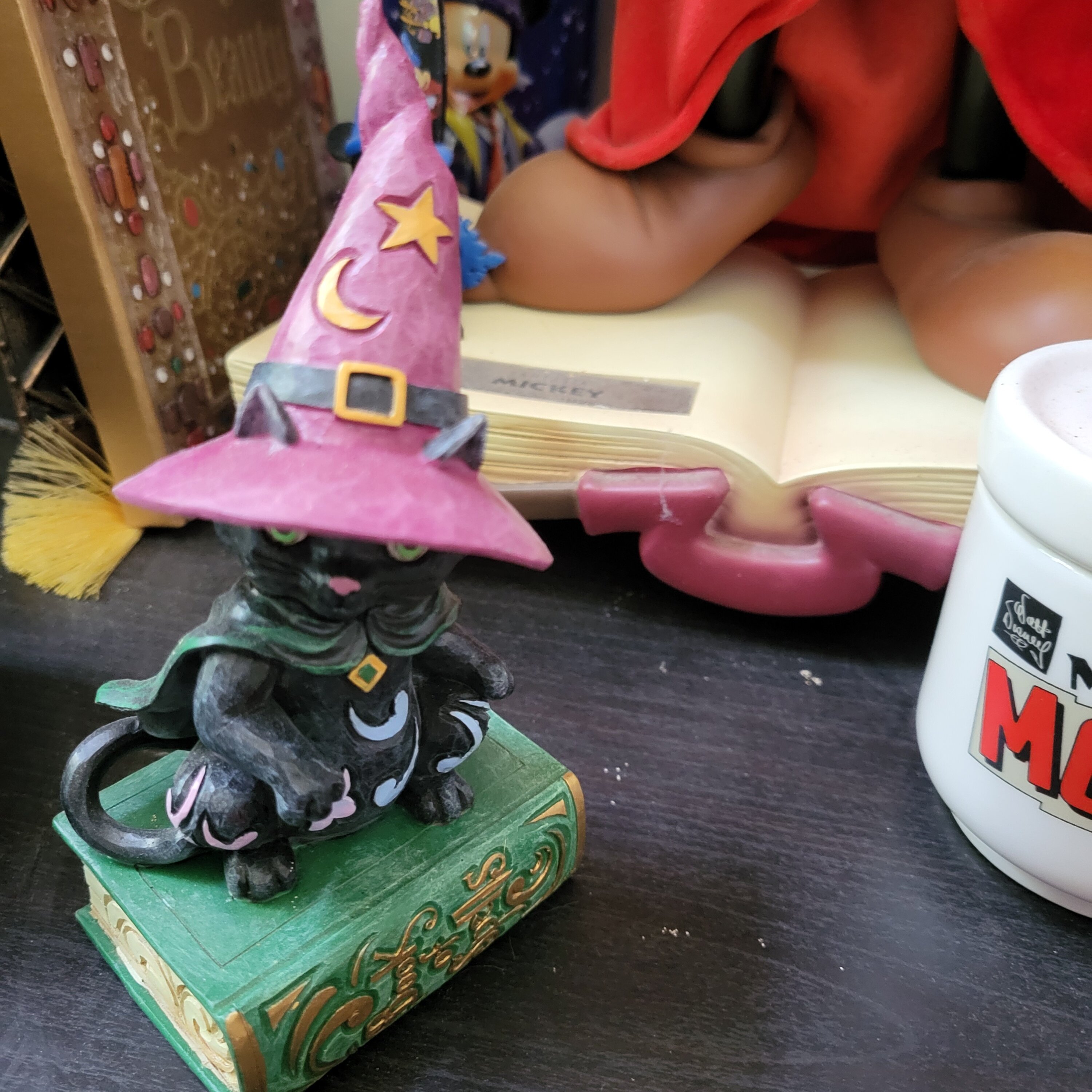 Porta un tocco di magia con questa adorabile statuetta di Jim Shore raffigurante un gatto nero con cappello e mantello da strega. Seduto su un libro di incantesimi, questo piccolo felino aggiunge un tocco di dolcezza e fascino alle tue decorazioni Halloween .