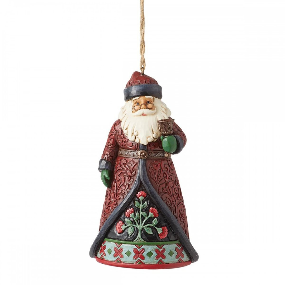 Babbo Natale appeso con in mano una campana di Natale. Progettato dal pluripremiato artista Jim Shore come parte della collezione Holiday Manor Heartwood Creek. Materiale: resina