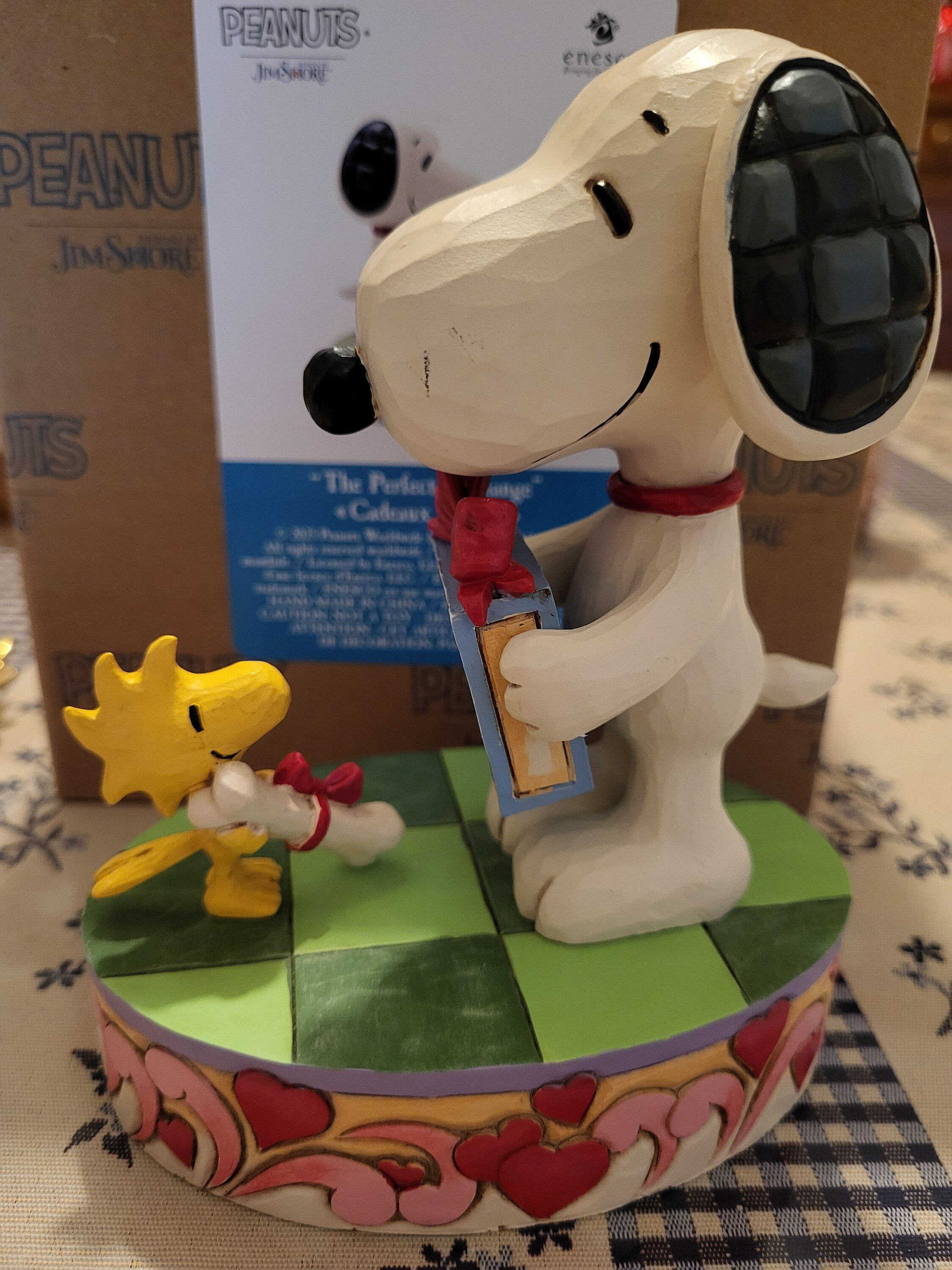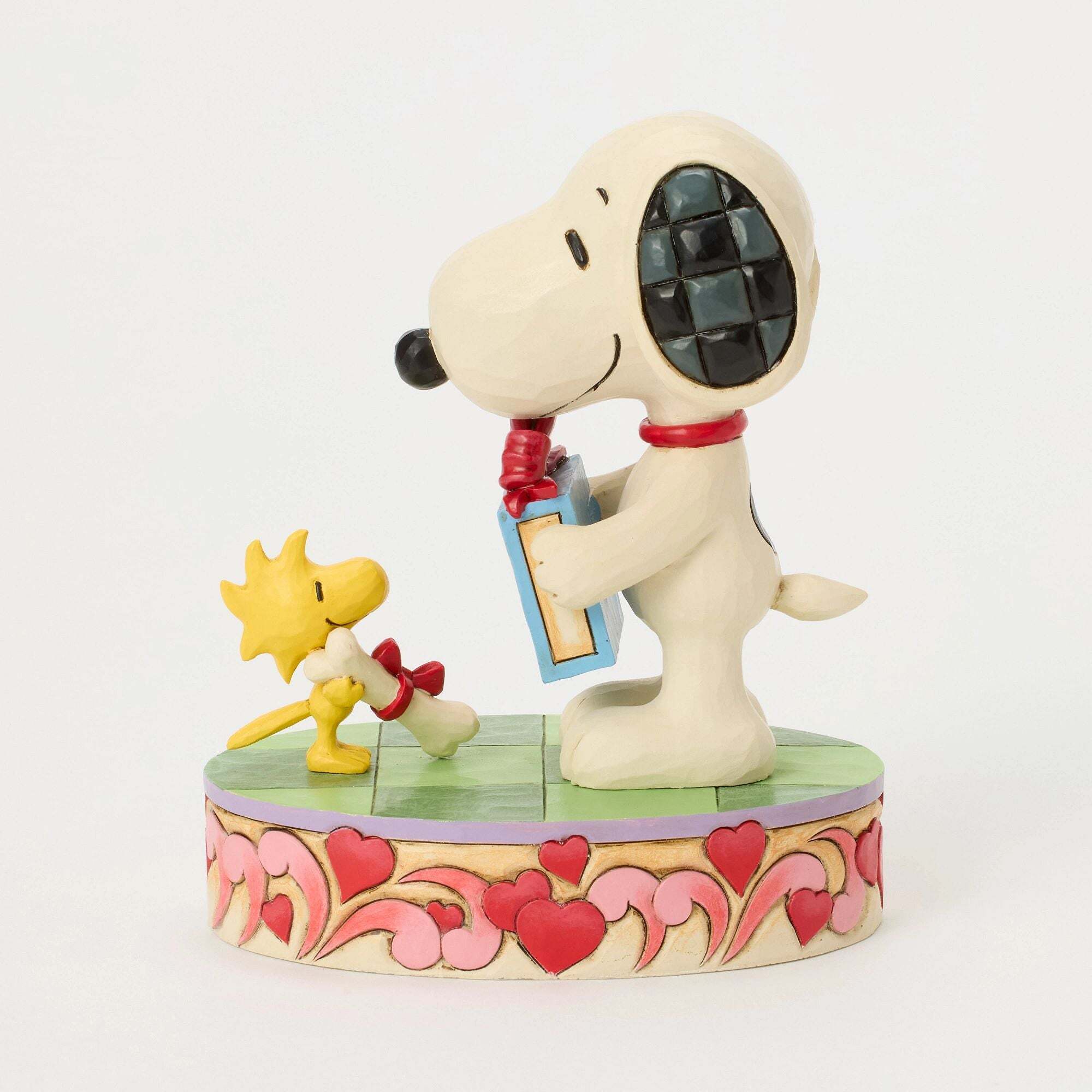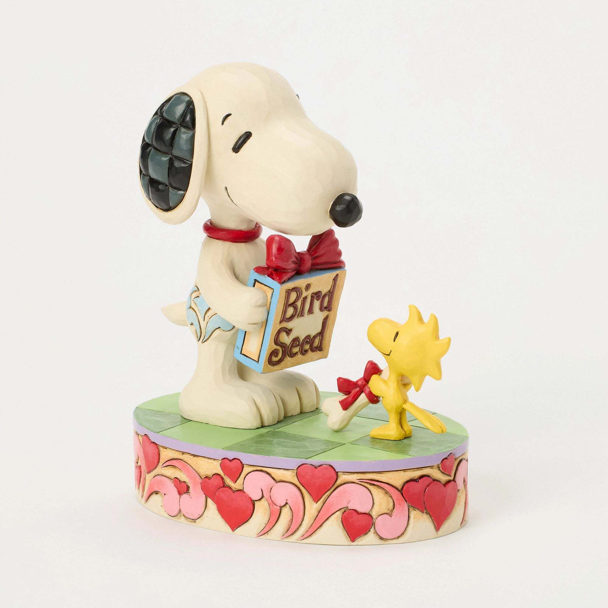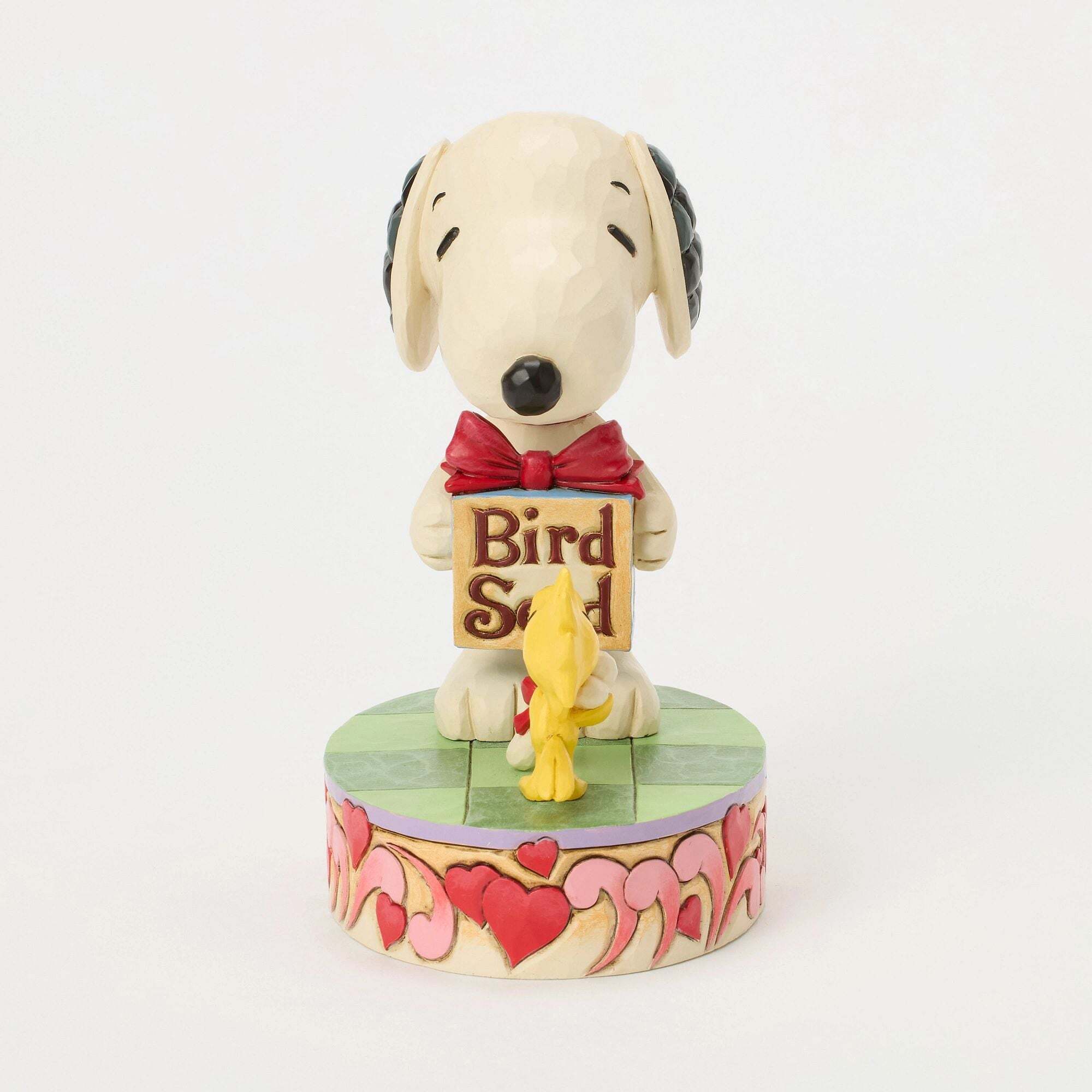 Snoopy e Woodstock condividono un tenero momento di amicizia e amore in questa creazione di Jim Shore per San Valentino . Decorata con cuori e i motivi folkloristici tipici dell'artista, la scena lumière uno scambio toccante: Snoopy offre semi all'amico e in cambio riceve un meritato osso. Una celebrazione piena di dolcezza e complicità. Queste statuette non sono giocattoli per bambini. Destinate solo agli adulti. Altezza: 13,5 cm