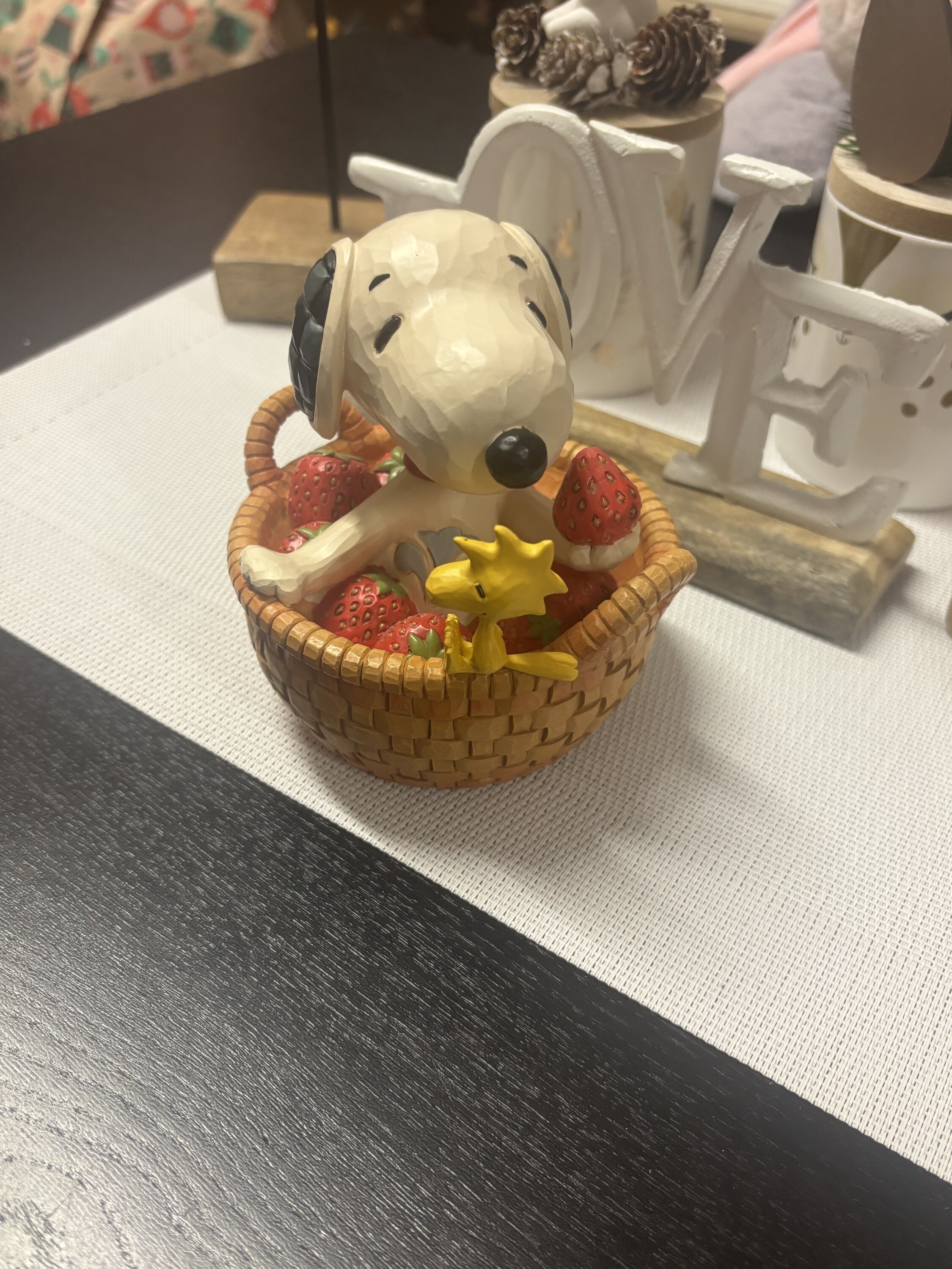 "Snoopy e Woodstock sono pieni di felicità in questa tenera statuetta. Adagiati in un cesto di fragole appena raccolte, celebrano insieme la dolcezza della primavera. Il tutto impreziosito dalla maestria artigianale, dai colori vivaci e dal fascino naturale tipici di Jim Shore. Queste statuette non sono giocattoli per bambini. Destinate solo agli adulti." Altezza: 12,5 cm