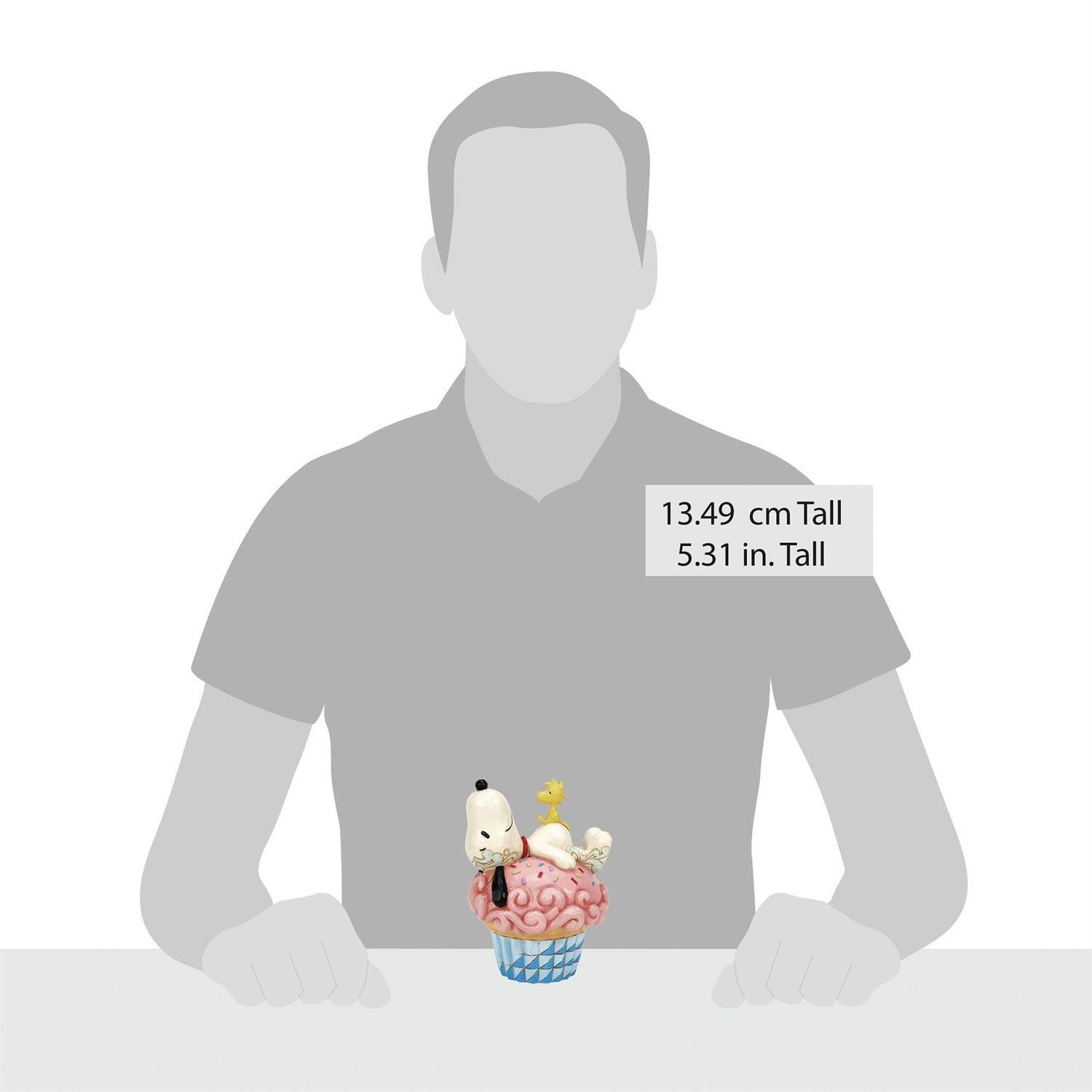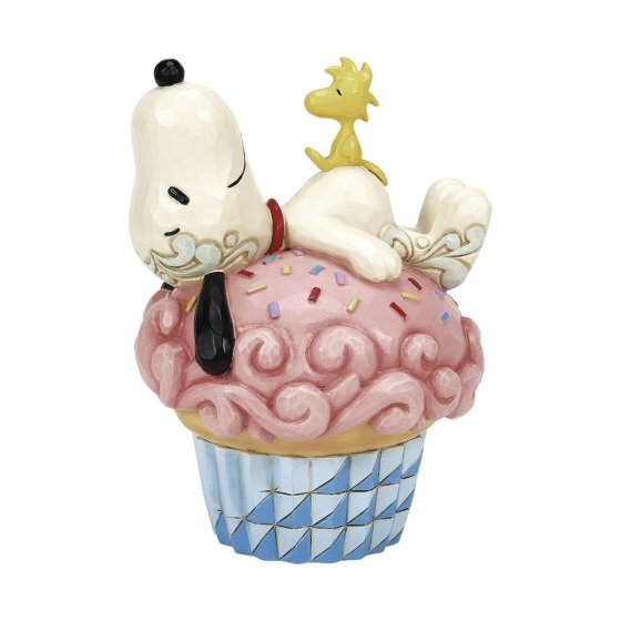 Nell'affascinante design di Jim Shore, Snoopy fa un pisolino accogliente su un grande cupcake rosa cosparso di granelli di polvere, decorato con intricati dettagli a forma di rosetta e glassa invitante. Per aggiungere dolcezza, Woodstock si unisce al pigiama party sopra Snoopy.