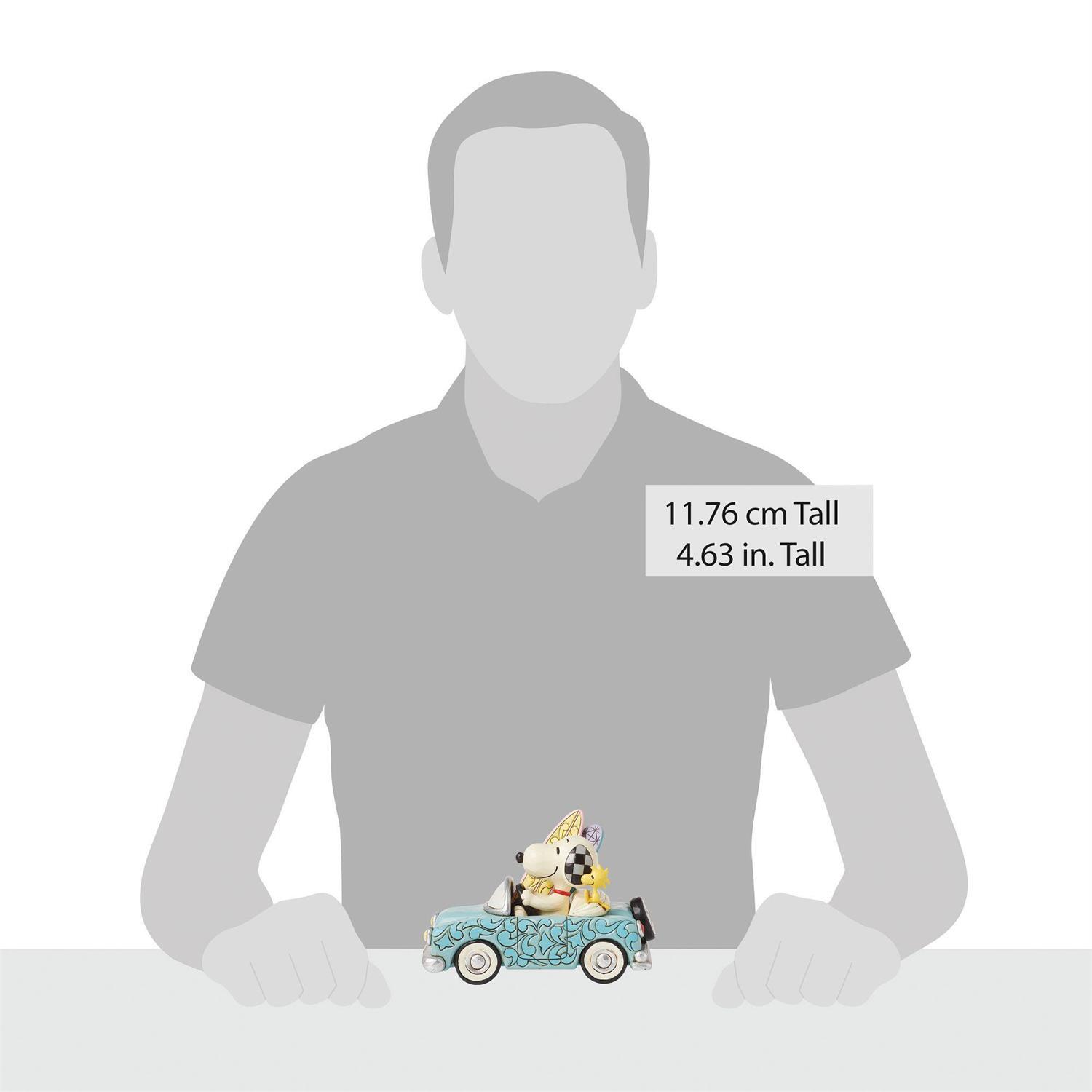 Snoopy è al volante in questa deliziosa creazione Jim Shore : lui e Woodstock si dirigono verso la spiaggia a bordo di un'appariscente decappottabile piena di tavole da surf. La coppia si prepara a cavalcare le onde a bordo di un'auto alla moda, decorata con incantevoli dettagli rosemaling.