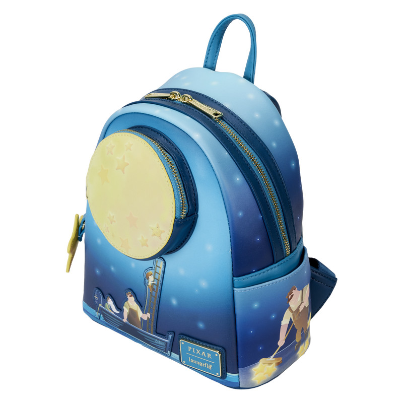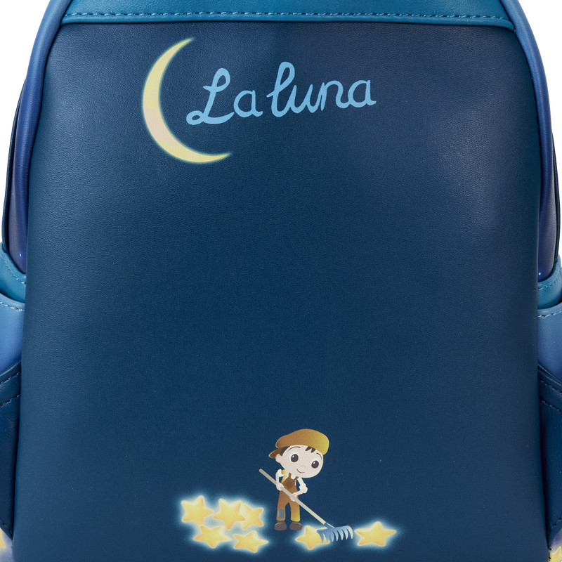 Trova il tuo posto tra le stelle con il mini zaino Loungefly Disney-Pixar La Luna Glow! Sul davanti, una grande tasca con cerniera a forma di luna è sospesa in un cielo stellato.