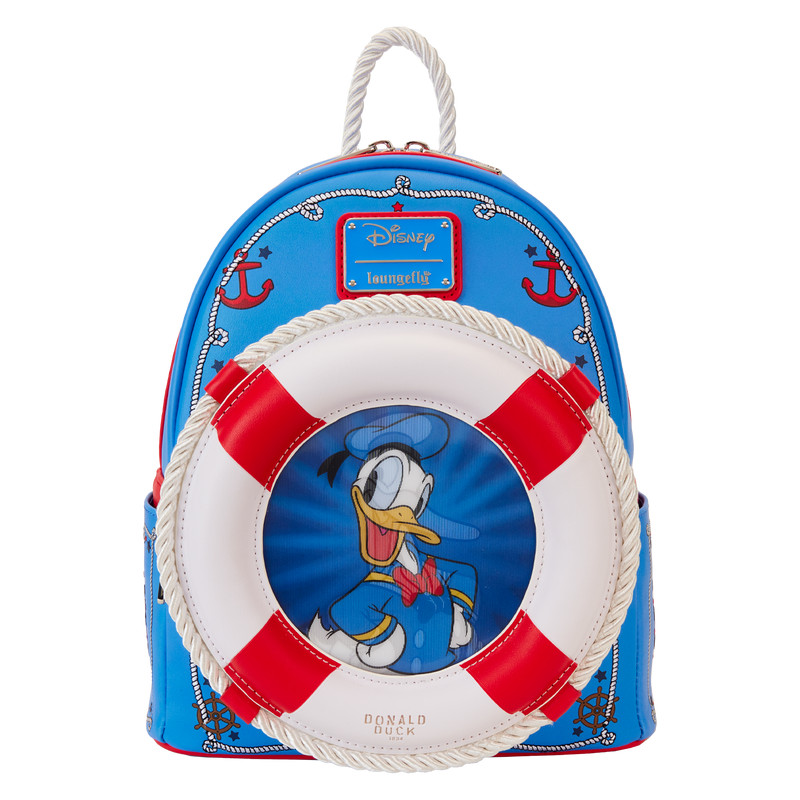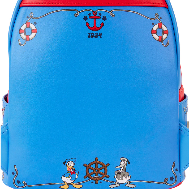 Oh, ragazzi, oh ragazzi, ahoy! Salpa con qualcosa di divertente! Paperino della Disney è il protagonista di questo pratico zaino. La tasca circolare frontale presenta un salvagente con vera corda e al centro appare il volto di Paperino. I dettagli Lenticolare lo rivelano in bianco e nero, ma con un semplice movimento del polso il suo volto appare a colori. I disegni stampati di stelle, ancora e corde nautiche, su questo zaino blu, aggiungono tocchi di colore in rosso e blu più scuro. L'opera d'arte originale continua sui lati e sul retro di questo accessorio, che presenta la data dell'anniversario del 1934. Una maniglia superiore in vera corda aggiunge praticità e rifinisce il look con carattere extra. Fai scalpore mentre festeggi il 90° anniversario di Paperino con stile.