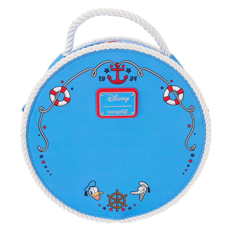 Oh, ragazzi, oh ragazzi, ahoy! Salpa con qualcosa di divertente! Paperino della Disney è il protagonista di questo pratico accessorio, che ricorda un salvagente completamente figurato. Il volto di Paperino appare al centro in bianco e nero, ma con un semplice movimento del polso i dettagli lenticolare lo rivelano a colori. La corda bianca, lungo i bordi e per la maniglia superiore, crea un tocco autentico. Sul retro compaiono ulteriori stampe nautiche, tra cui un'ancora con la data 1934. Paperino fa il bis in bianco e nero, e a colori, con in mezzo il timone di una nave. Fai scalpore mentre festeggi il 90° anniversario di Paperino con stile.