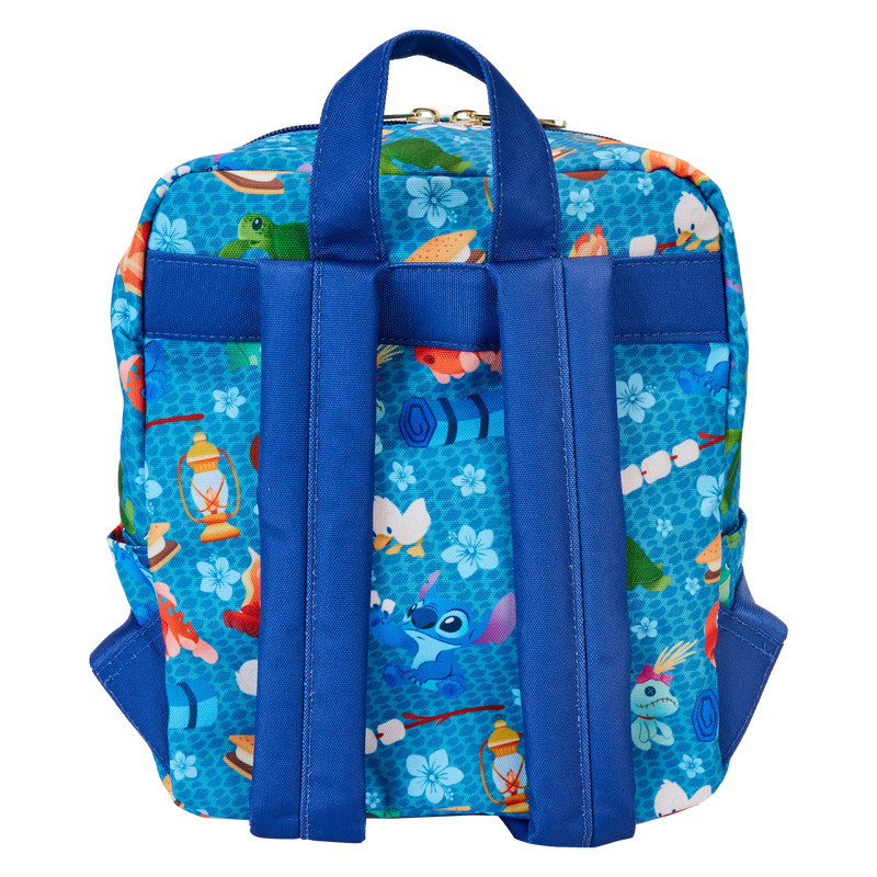 Il mini zaino in nylon Loungefly Stitch Camping Cuties AOP presenta dettagli stampati. La borsa ha spallacci regolabili e hardware dorato lucido. Prendi nota della fodera interna coordinata.