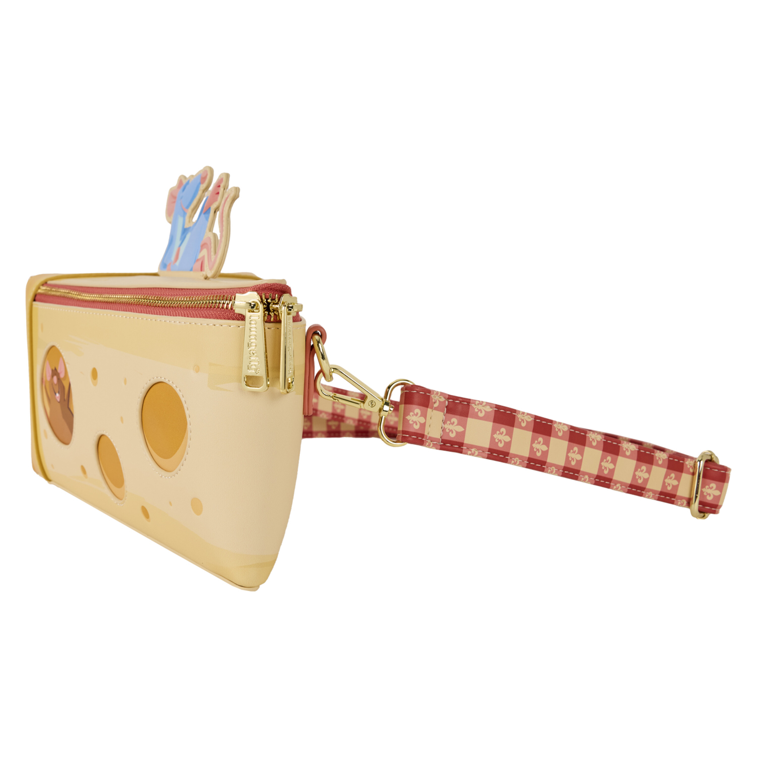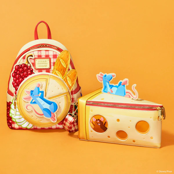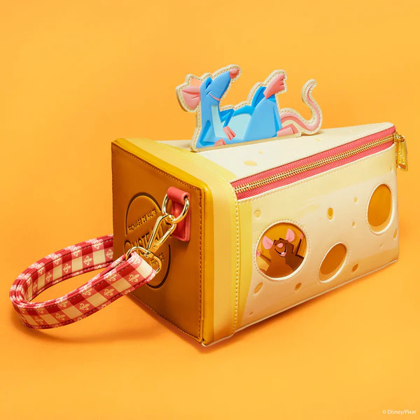 La borsa di cui non sapevi di aver bisogno nella vita: una a forma di fetta di FORMAGGIO! Questa è per tutti gli appassionati di salumi. Remy si rilassa in un'applicazione sulla parte superiore della borsa. Ai lati, troverai personaggi familiari visibili nei buchi del formaggio. La "crosta" del formaggio ha il logo Gusteau impresso. Dai, quanto sarebbe iconico andare al tuo ristorante preferito con una borsa portaformaggi?!