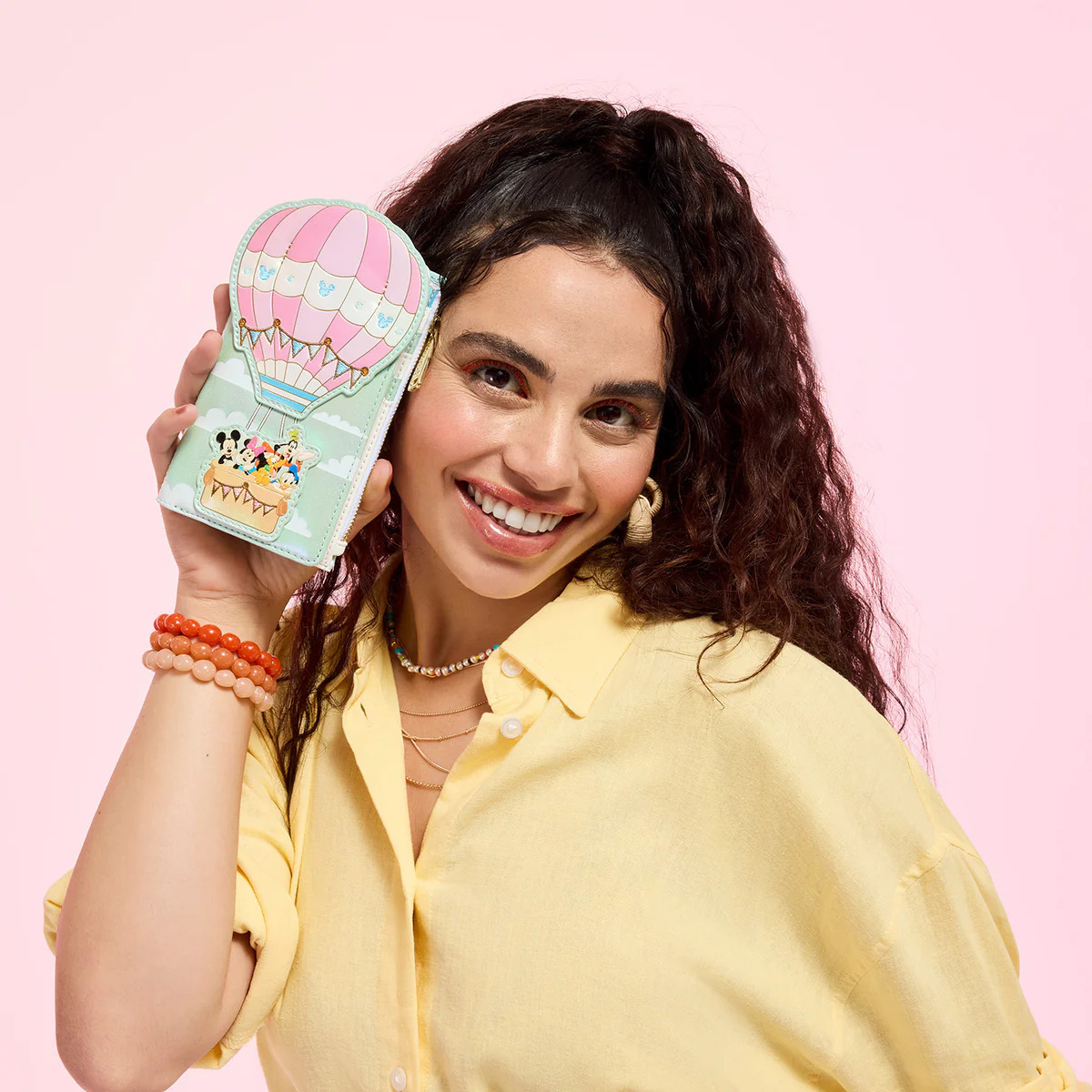 Fai risaltare il tuo stile con questo portafoglio! Sul davanti troverai un'applicazione di una mongolfiera con alcuni dei tuoi personaggi Disney preferiti al seguito! Sul retro, troverai altre mongolfiere che fluttuano nel cielo. Dai un'occhiata all'interno e troverai sette scomparti per carte di credito e uno scomparto trasparente per un documento d'identità.
