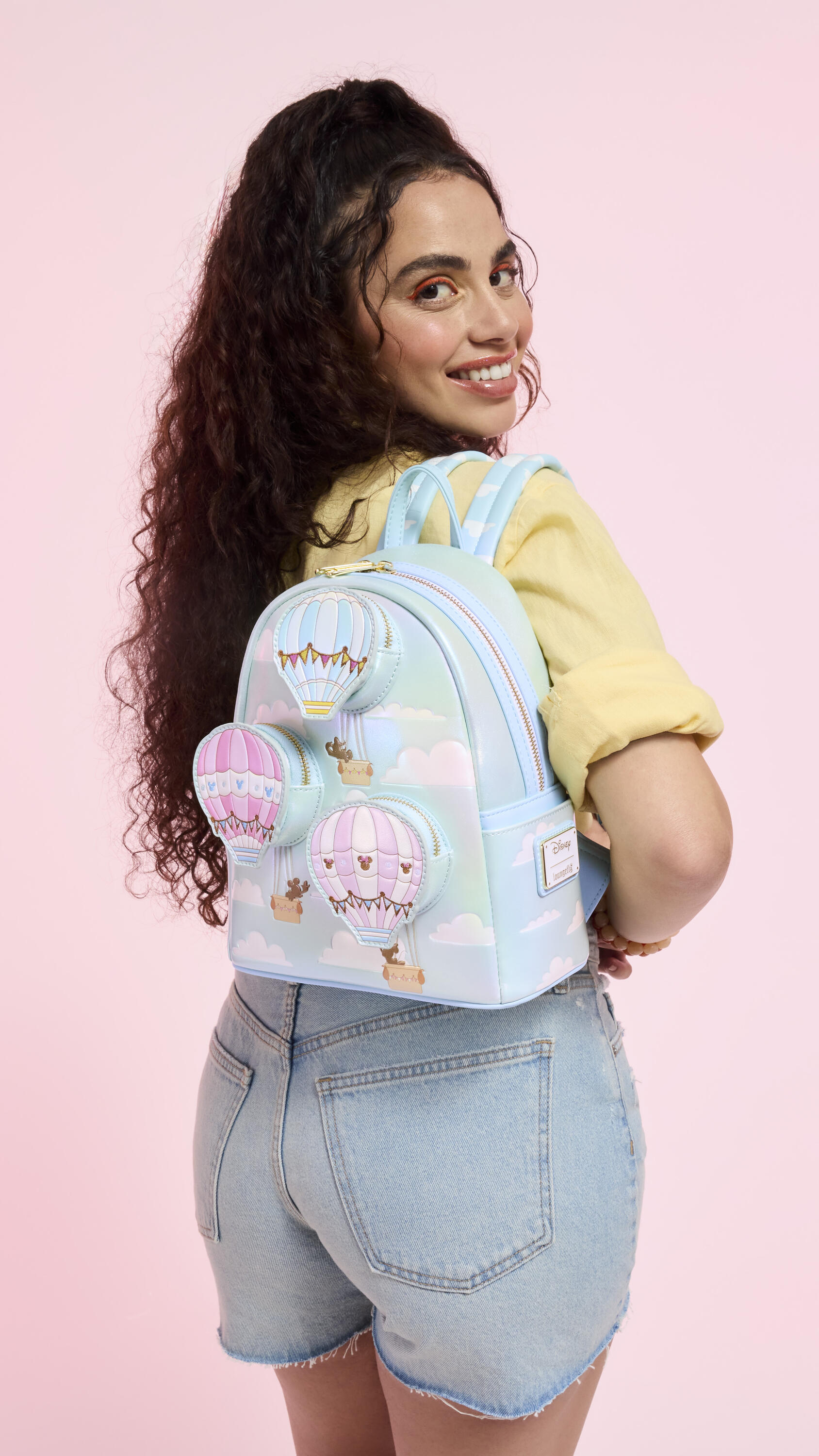 Questo mini zaino è dotato di tre mini tasche frontali che sembrano mongolfiere che fluttuano tra le nuvole. Guarda attentamente, troverai le sagome di alcuni dei tuoi personaggi Disney preferiti nei cestini. Il materiale perlescente e le nuvole illustrate sulle tracolle completano il look.