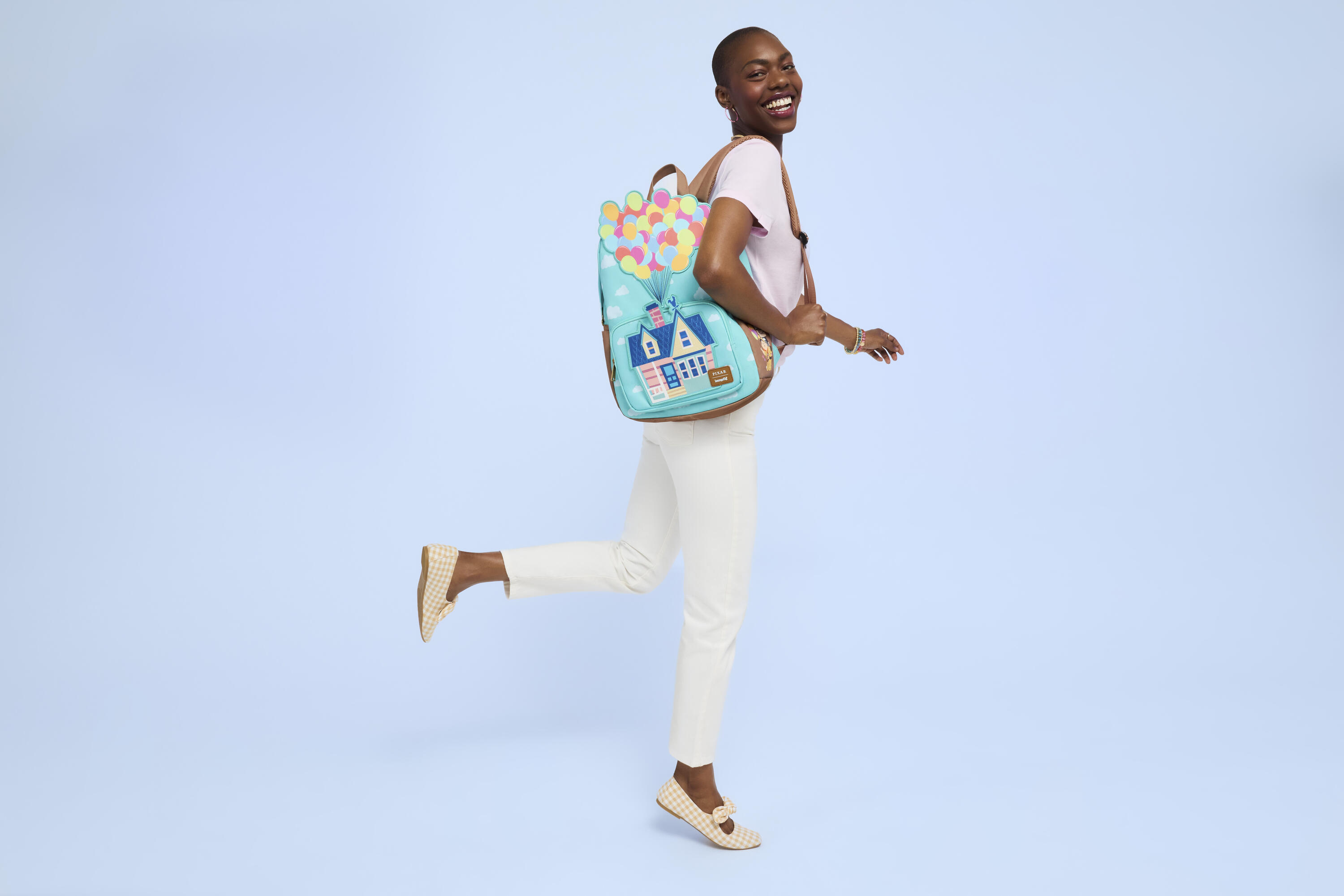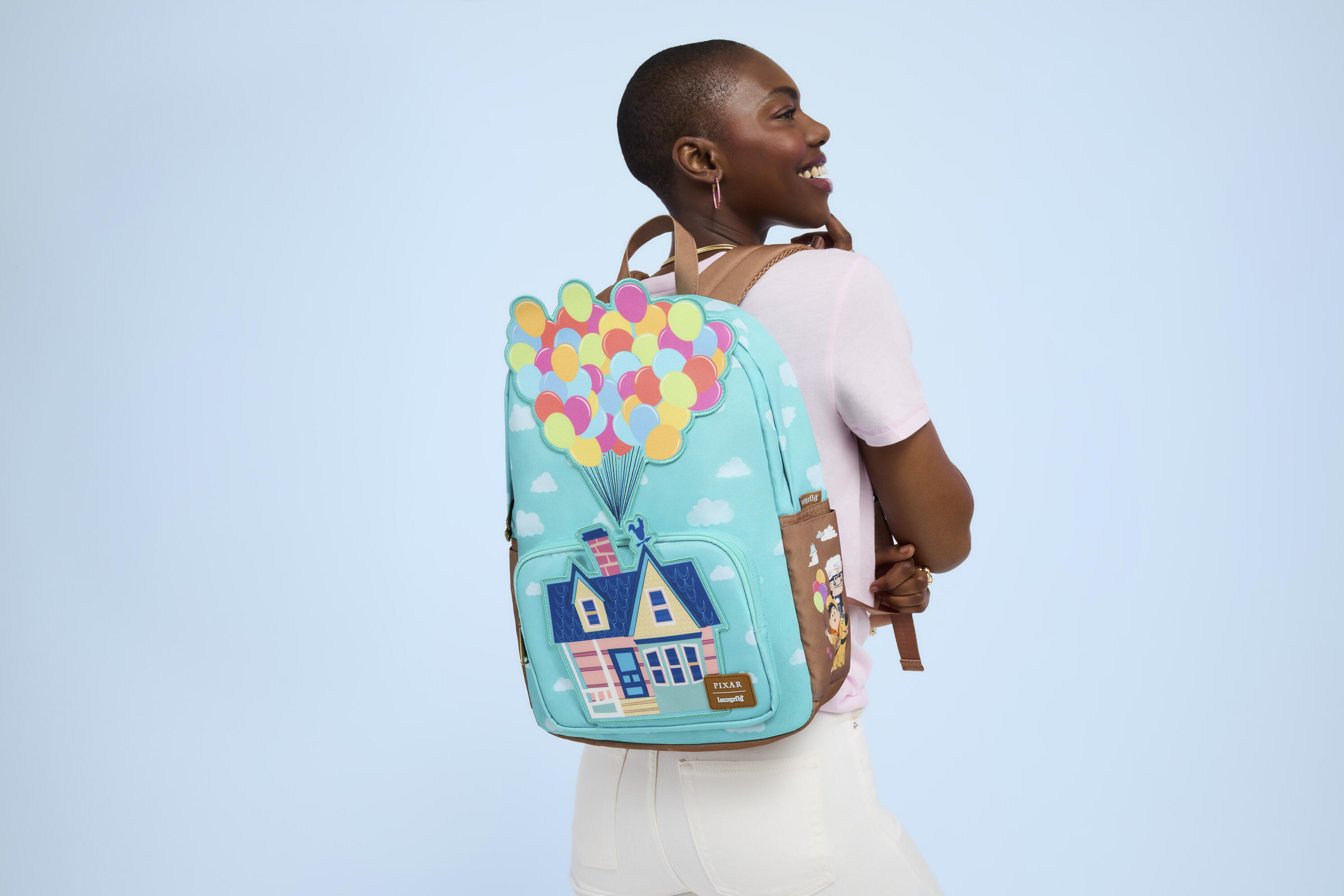 Questa borsa grande è ispirata a Up della Disney-Pixar. La parte anteriore della borsa presenta una stampa all-over di nuvole in un cielo terso. La tasca anteriore raffigura la casa di Carl, sopra la quale si estende un'applicazione di palloncini. Dai un'occhiata alle tasche laterali per trovare le immagini di alcuni dei tuoi personaggi preferiti!