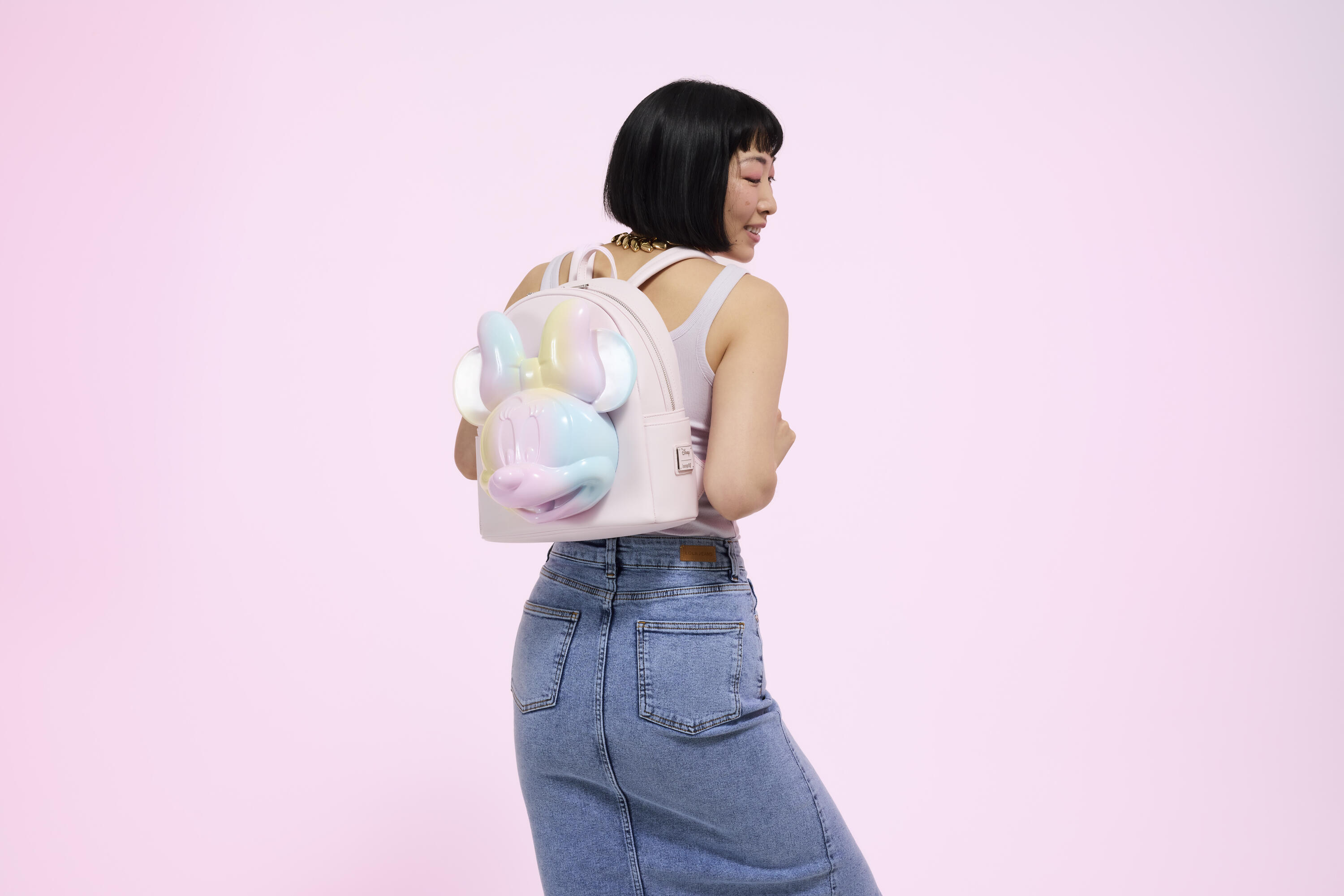 Questo zaino presenta una testa Minnie stampata in 3D! Sorride dalla parte anteriore della borsa. Minnie è decorata con una stampa tie-dye nei toni pastello di rosa, blu e giallo.