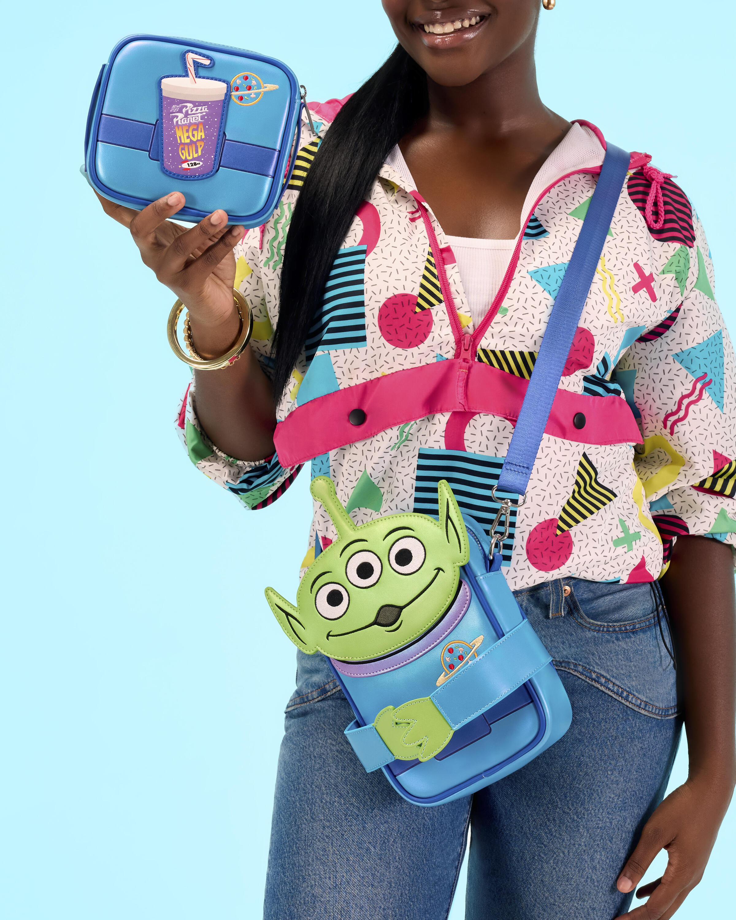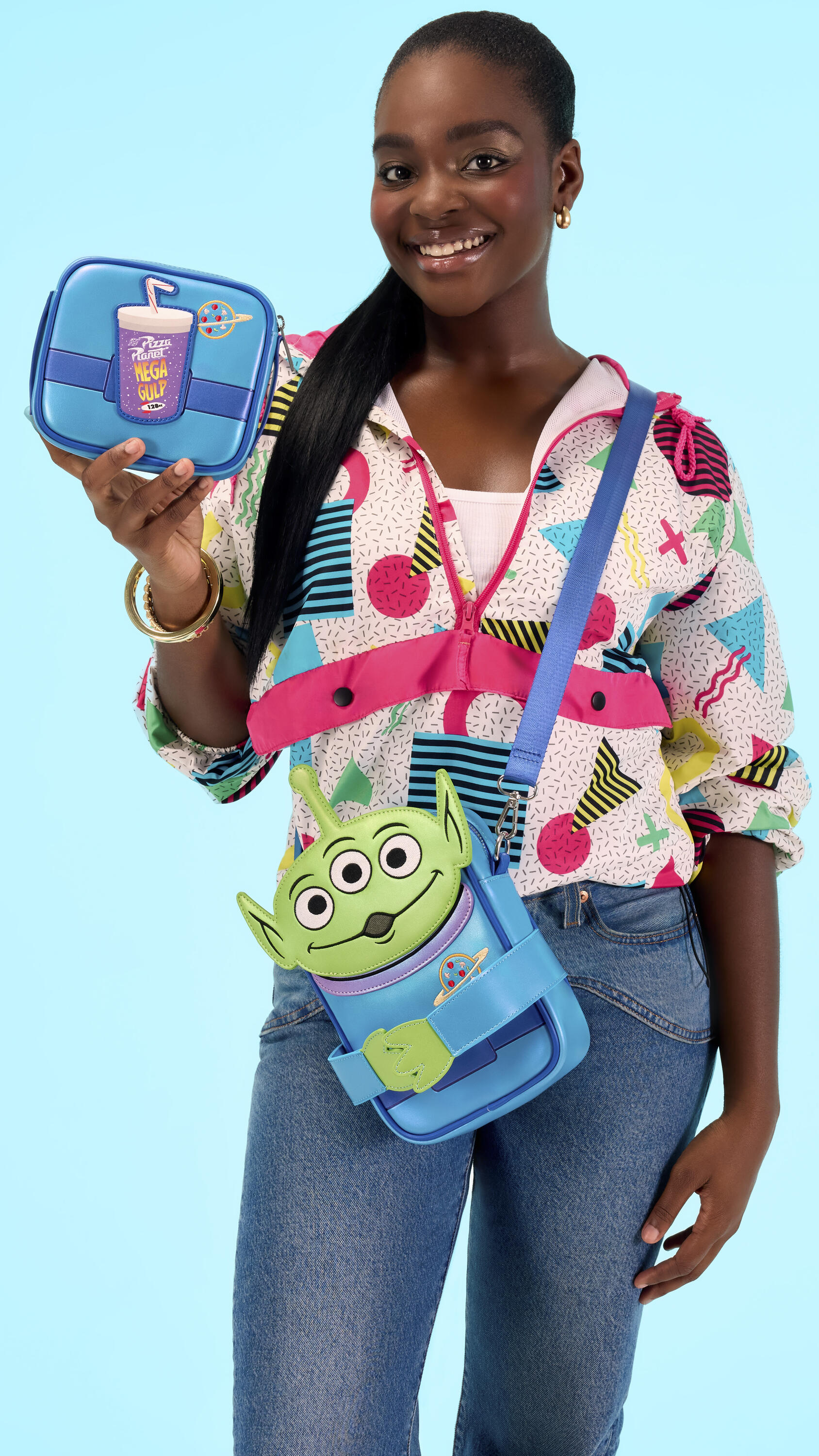 OOOOOOOHHH! Una nuova borsa Crossbuddies! Questa borsa Crossbuddies ha la forma di uno degli alieni di Toy Story della Disney. I suoi bracci si estendono sul davanti per abbracciare un portamonete reversibile e rimovibile. Su un lato del portamonete troverai una fetta di pizza, sull'altro una bibita! Gira la borsa per trovare altri alieni. Sotto di loro c'è scritto "OOOOOOOHHH". Questa è una sac bandoulière davvero divertente per fare una dichiarazione e celebrare il tuo film Disney preferito!