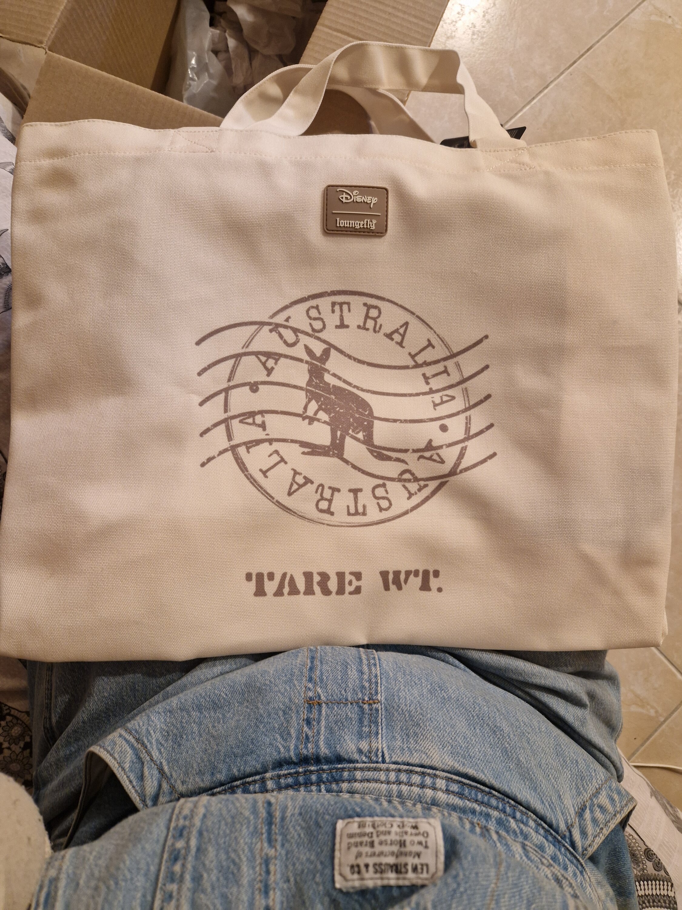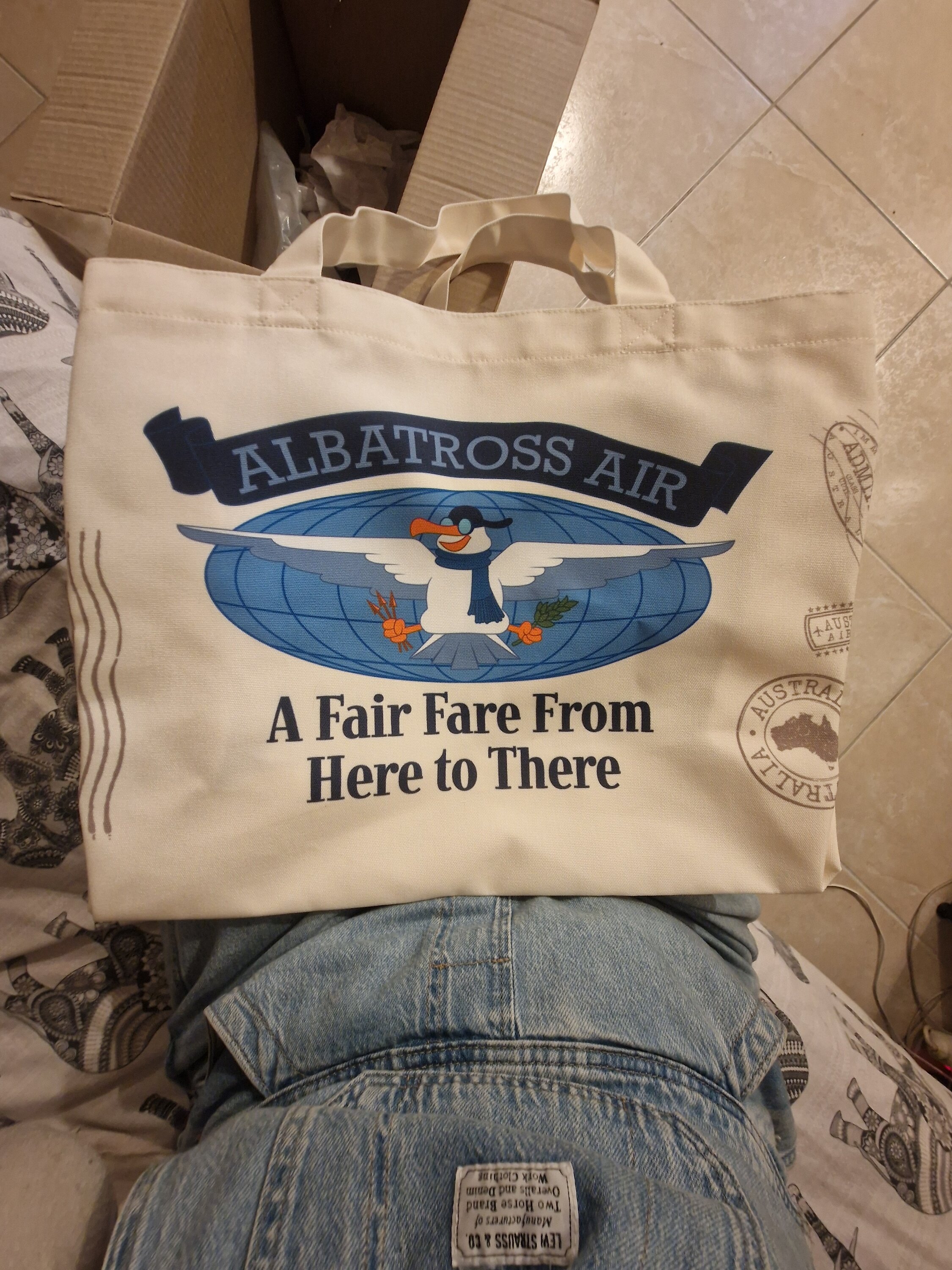 Questa sac tote in tela rende omaggio a "Bianca e Bernie nella terra dei canguri" della Disney e presenta il logo di Albatross Air. Troverai il simbolo di Albatross davanti a un globo. Sopra c'è uno striscione con la scritta "Albatross Air" e sotto "Una tariffa equa da qui a lì". Lungo il lato vedrai la scritta "Express" e altri simboli stampati sulla borsa. Giralo per trovare un altro ""francobollo"" dell'Australia.