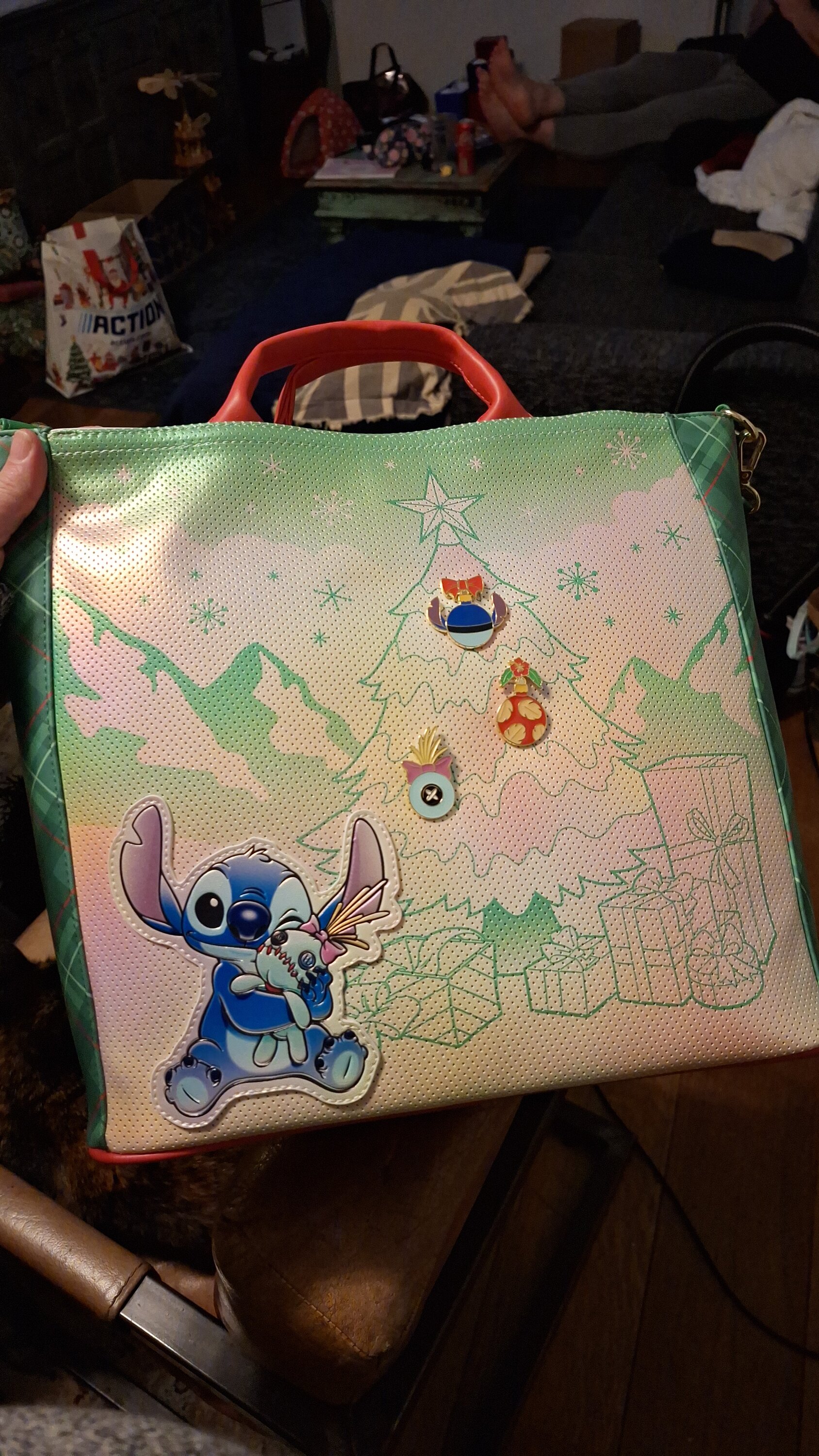 Questa sac tote raffigura Stitch seduto accanto a un albero Natale circondato da regali. La parte anteriore della borsa è in similpelle traforata. Sono incluse pins smaltate a forma di decorazioni. Puoi attaccare le pins alla similpelle traforata e decorare l'albero! I lati della borsa presentano un motivo scozzese a tema natalizio e il retro presenta diversi simboli natalizi, come ornamenti e fiocchi di neve, su un materiale perlato.