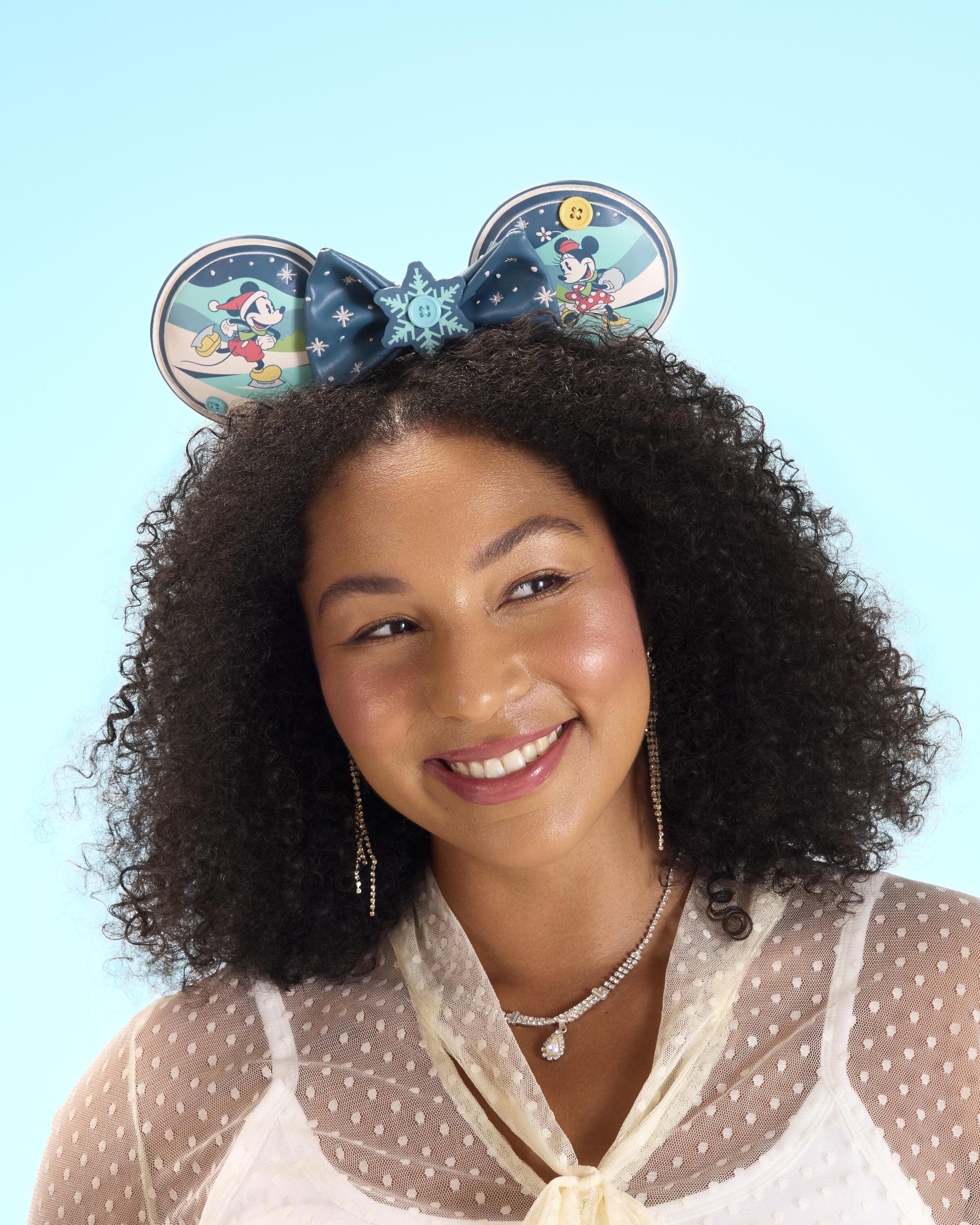 Questo cerchietto con orecchie raffigura Topolino e Minnie che pattinano sul ghiaccio. Troverai un fiocco rimovibile tra le orecchie, con un ciondolo a forma di fiocco di neve al centro e stelle sul fiocco. Giralo per trovare un motivo trapuntato sul retro delle orecchie raffigurante alberi sempreverdi.