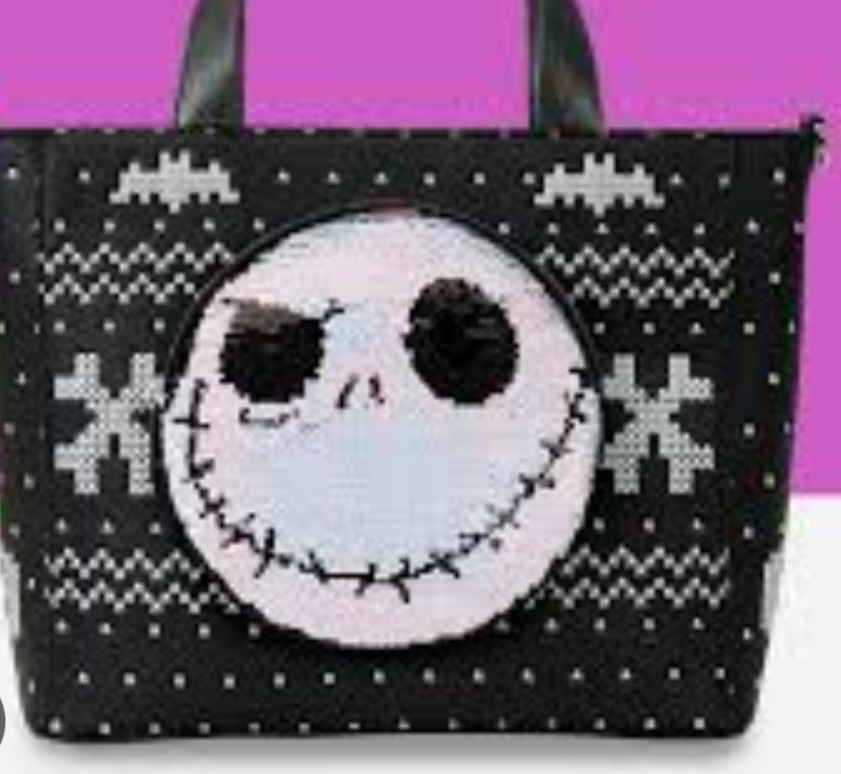 Questa borsa tote presenta un'immagine ispirata a un maglione natalizio. Troverai pipistrelli, motivi a zig zag e la scritta ""Pumpkin King"" sul retro. Sul davanti, troverai il volto di Jack Skellington fatto di paillettes. Le paillettes sono reversibili, quindi l'immagine si trasforma in una zucca di Halloween! Il portamonete attaccato alla tracolla si abbina all'immagine di Jack sulla borsa e può essere scambiato con una zucca di Halloween!