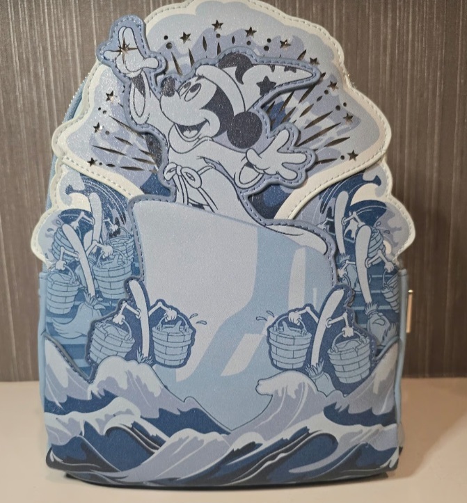 Questo mini zaino è ispirato a Fantasia della Disney. Troverai Topolino Stregone al centro della scena mentre lancia magie (le stelle intorno a lui si illuminano!). Intorno a lui ci sono onde che si infrangono e le Scope Magiche! Lamina d'oro e similpelle scintillante rendono questo articolo davvero speciale.