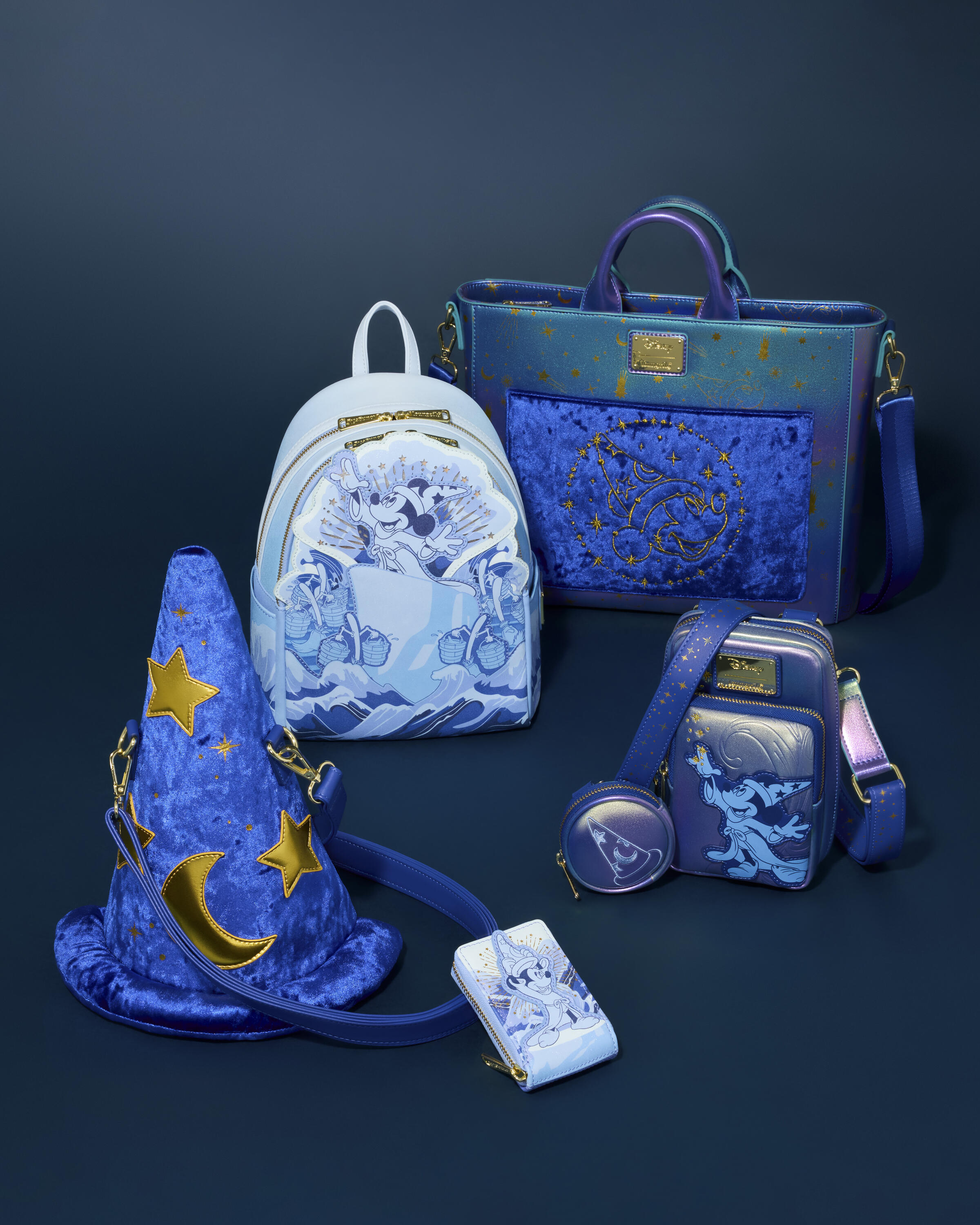 Troverai materiale iridescente blu reale che ricopre la borsa con stelle, lune e Topolino in lamina d'oro! La tasca anteriore presenta Topolino Stregone ricamato in oro su uno sfondo di velluto stropicciato. Questa borsa si trasforma da tote bag a zaino, così puoi indossarla come preferisci!
