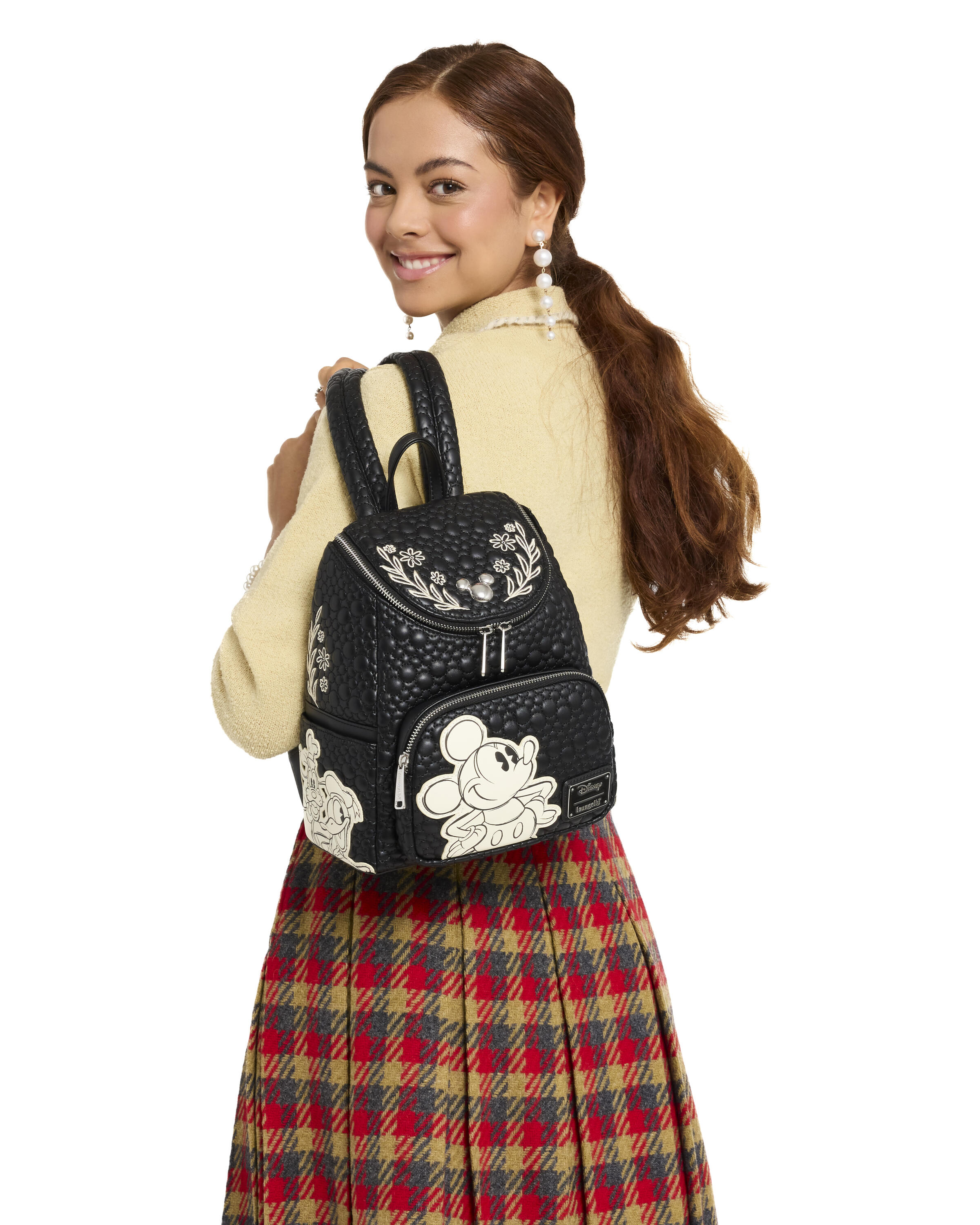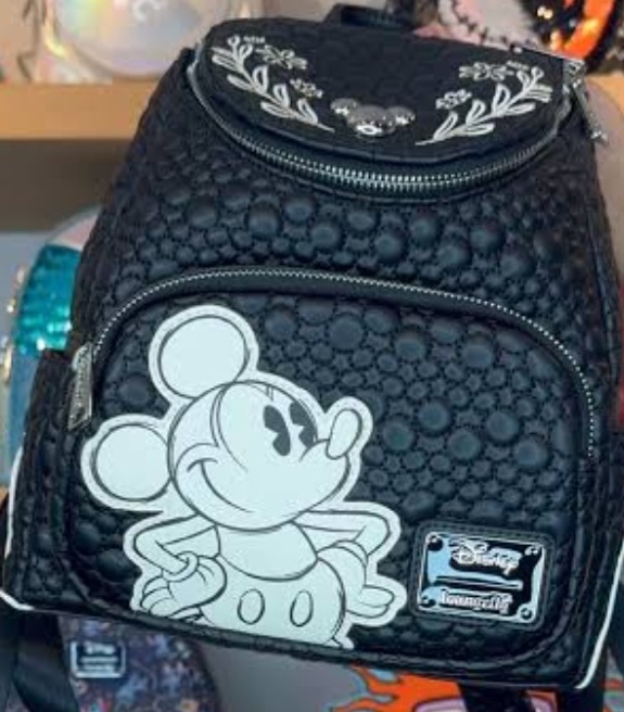 Questo mini zaino presenta Mickey & Friends "schizzati" sulla borsa su uno sfondo trapuntato con la silhouette di Topolino. Troverai Topolino sulla tasca frontale, mentre Minnie, Pluto, Paperino e Paperino sono sulle tasche laterali! Sulla patta superiore della borsa, troverai un ciondolo in metallo a forma di testa di Topolino circondata su entrambi i lati da foglie e fiori ricamati!