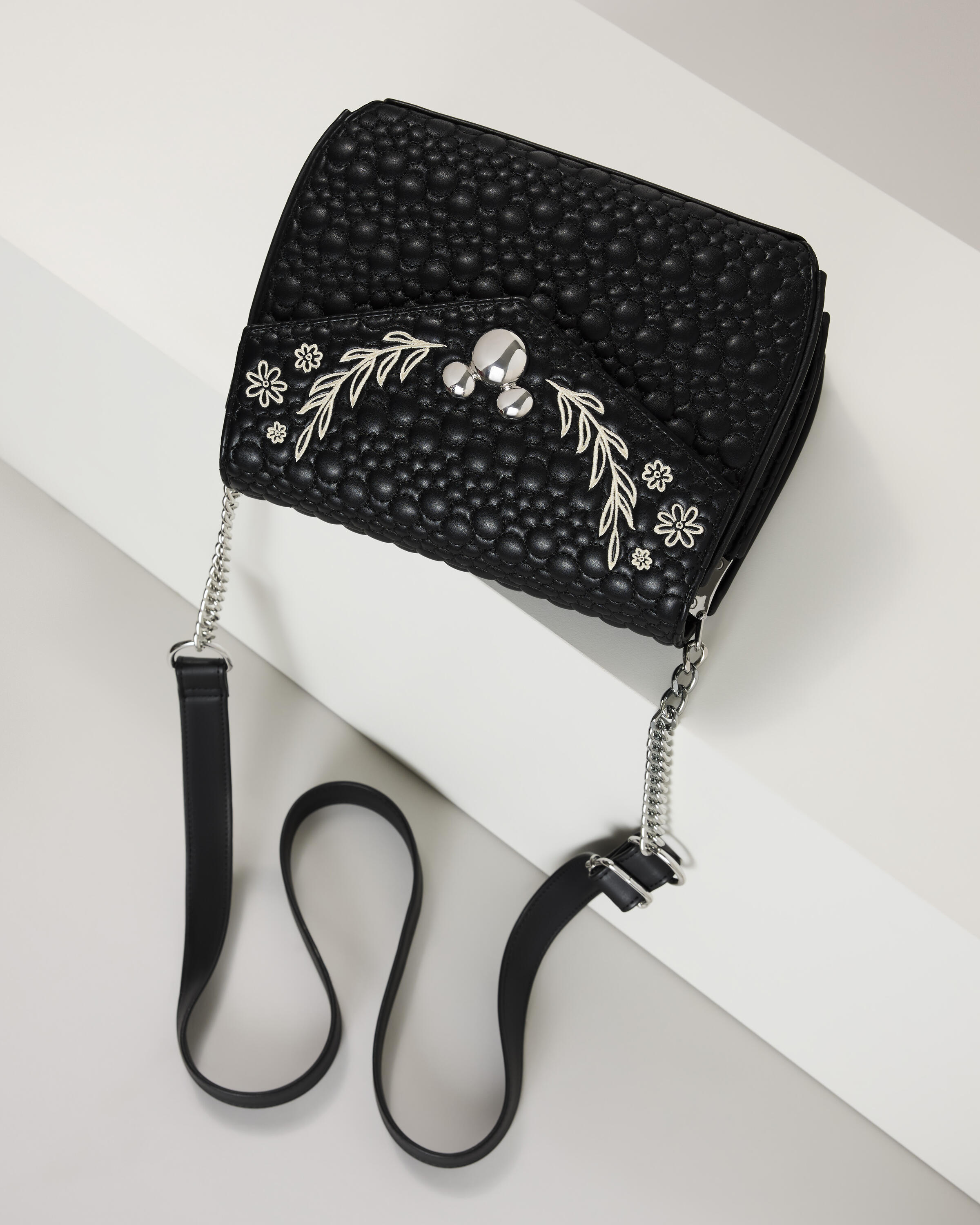 Questa borsa a tracolla presenta un motivo trapuntato con le sagome di Topolino . Sulla patta frontale, troverai un ciondolo in metallo raffigurante la sagoma di Topolino, affiancato da fiori e foglie ricamati. È un modo divertente per aggiungere un tocco di magia Disney al tuo outfit!